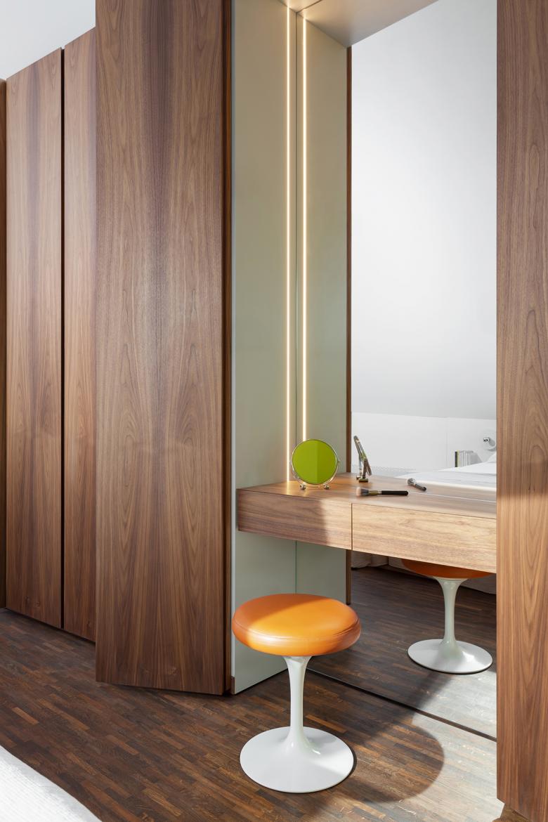 A prominent design feature was a massive Canaletto walnut volume, which acted as both a separator and connector on the top floor. This multifunctional element serves as a wardrobe, vanity unit, and toilet, and its imposing presence is visible from the living floor below. The intersection of this volume with the villa’s perimeter created a "water area" in the attic, where a concrete slab bridges the existing and new spaces. Glass architecture played a vital role, enhancing the connection between the interior and the surrounding landscape. The transparency of glass partitions maintained the open feel while subtly dividing spaces.