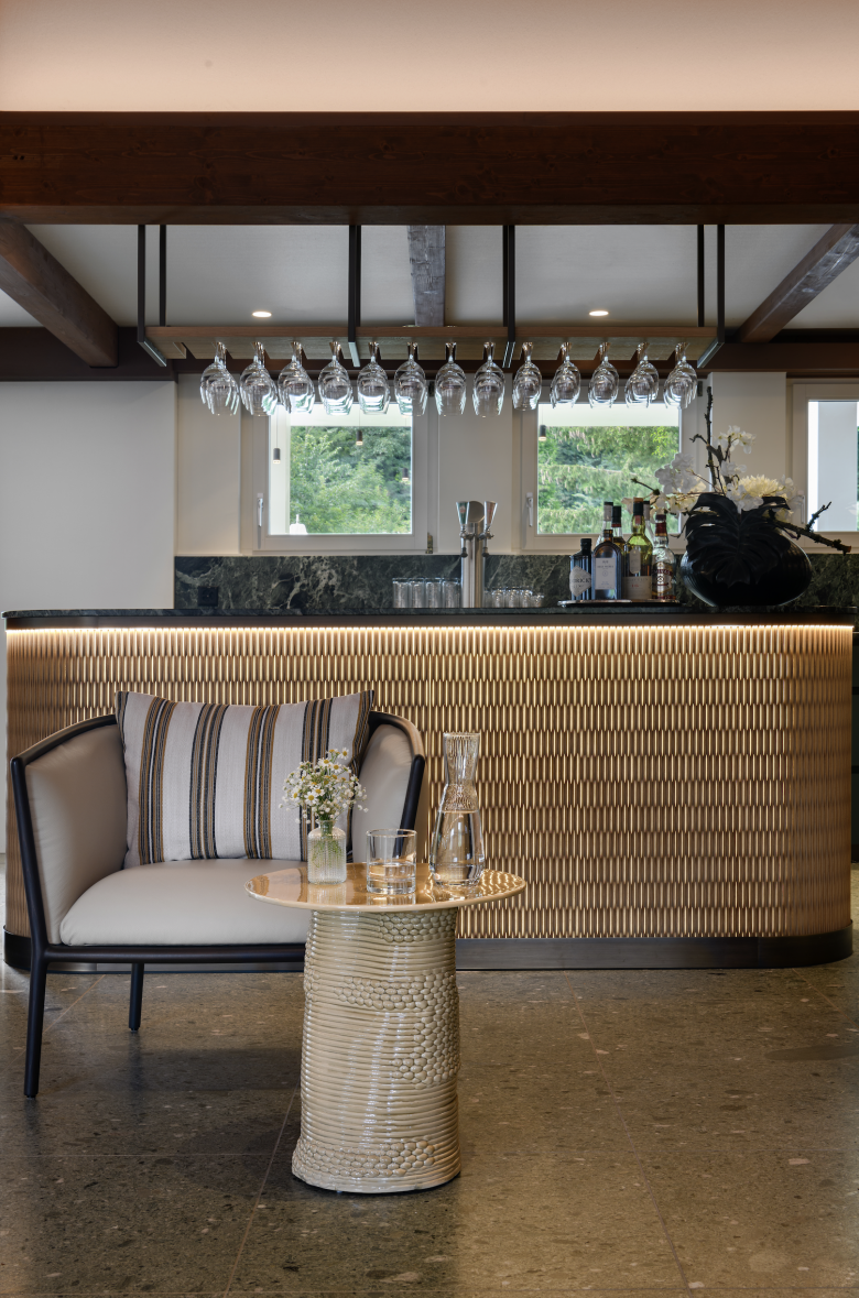 Let's not forget about the stunning green floor crafted from natural stone from the Salvan quarry in Valais. It not only adds a touch of nature to the design but also pays homage to the local surroundings.