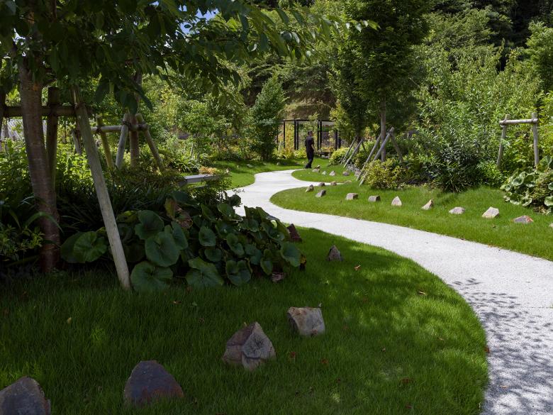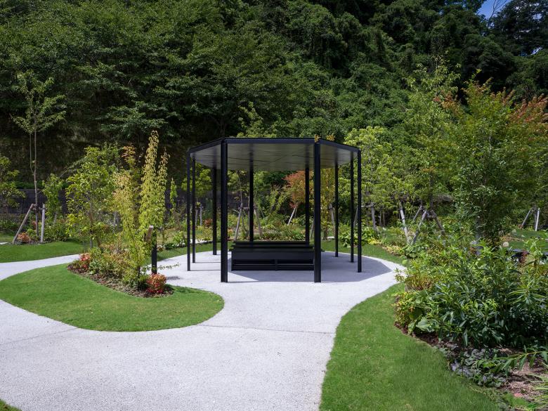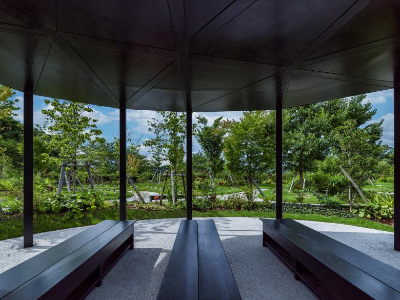 小径には視線や導線の調整を施し、歩みの速さや滞在時間に応じた記憶と感情の重なりを促す空間構成とした。また、道の途中には語らいや黙想、読書や休息に対応する余白として、ひとつの東屋を設けた。東屋は単なる休憩施設ではなく、風景と一体化した記憶の装置である。溝型鋼で構成された柱と梁は、屋根に降った雨水を開放竪樋として足元のポーラスコンクリートに導き、自然循環と接続する建築となっている。