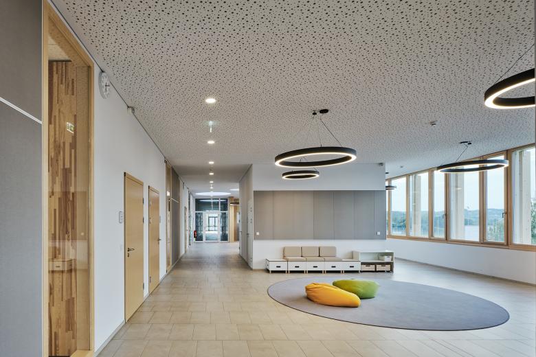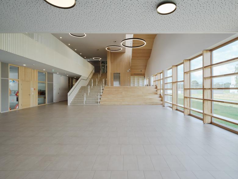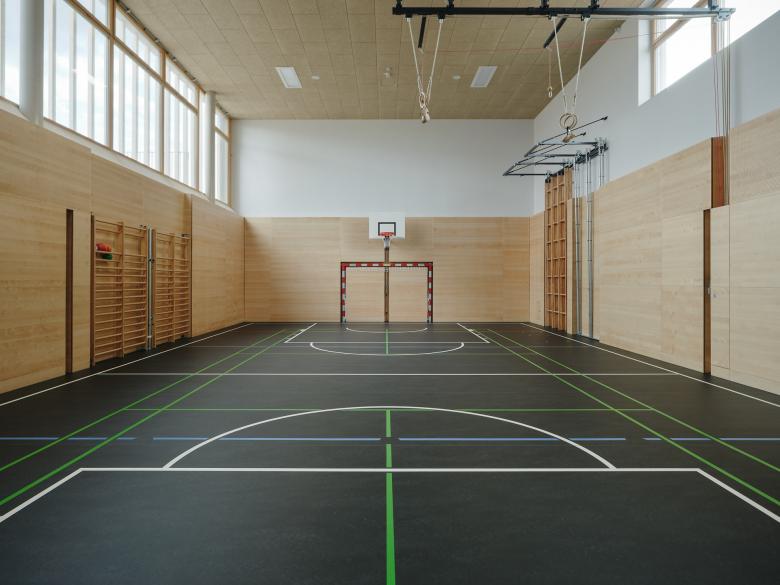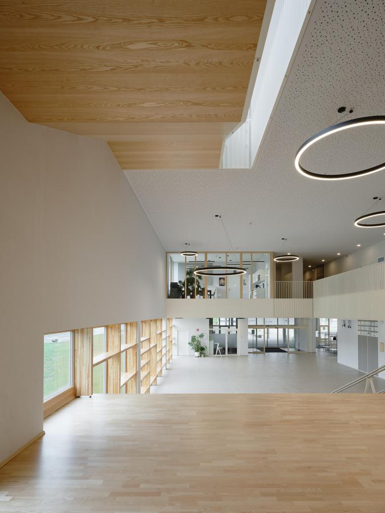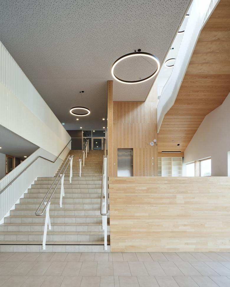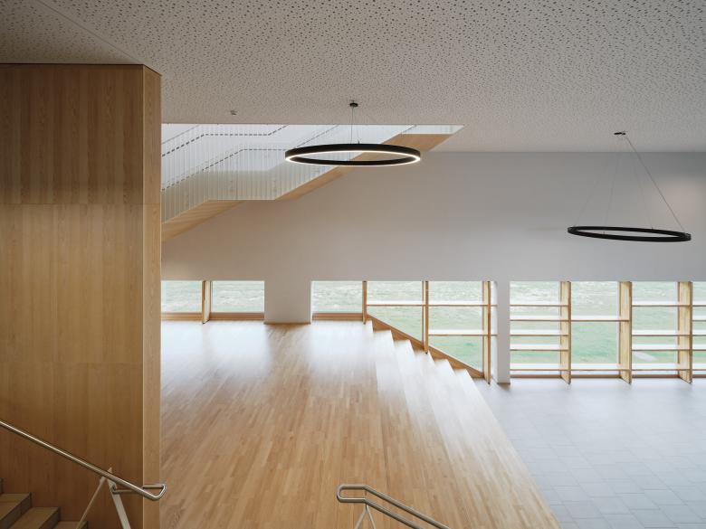 Die Aula ist der offene Lebens- und Aktionsraum für die unterrichtsbegleitenden Programme: seien es die Tagesbetreuung, aber auch Veranstaltungen. Die Freizeiträume sind unmittelbar – wiewohl Abtrennung möglich – in den Aulabereich integriert und bilden quasi zusammen mit den Sitzstufen eine großzügige Bespielungszone für die verschiedensten Aktivitäten. Hier ist auch die Bibliothek als wichtiger Teil des pädagogischen Gesamtkonzeptes integriert und animiert damit zum spielerischen Umgang mit dem Lesen. Die Sitzstufen können ebenso als Auditorium für die in unmittelbarere Nähe liegende ZMS oder umgekehrt als Bühne für performative Ambitionen verwendet werden.