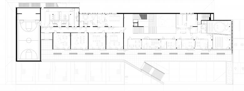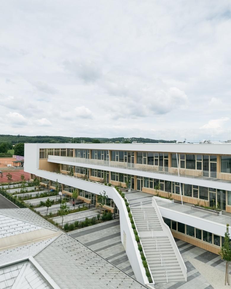 Zunächst gilt es, genug Freiraum zu belassen, um die Bewegung für die Schüler sicherzustellen. Das Projekt wurde – dem schlanken Zuschnitt des Grundstücks geschuldet – als sich längs erstreckender, gestufter Baukörper in dreigeschossiger Bauweise angelegt.