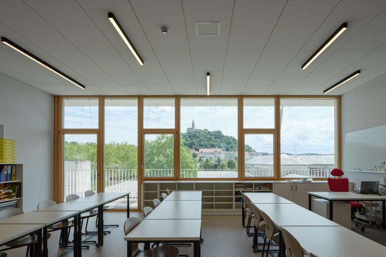 Das Objekt ist nicht nur in der Organisation, sondern auch in der Konstruktions- bzw. Bauweise rational angelegt. Die Haupttragteile folgen dem Raster der Klassen über alle Ebenen, sodass eine effiziente Auslegung der Stützen, Scheiben und Plattendecken gegeben ist. Es soll im Sinne der nötigen Speichermasse in Massivbauweise gebaut werden, Holz wird für untergeordnete Bauteile und für Oberflächen im Sinne haptischer und stimmungsmäßiger Raumqualitäten eingesetzt.