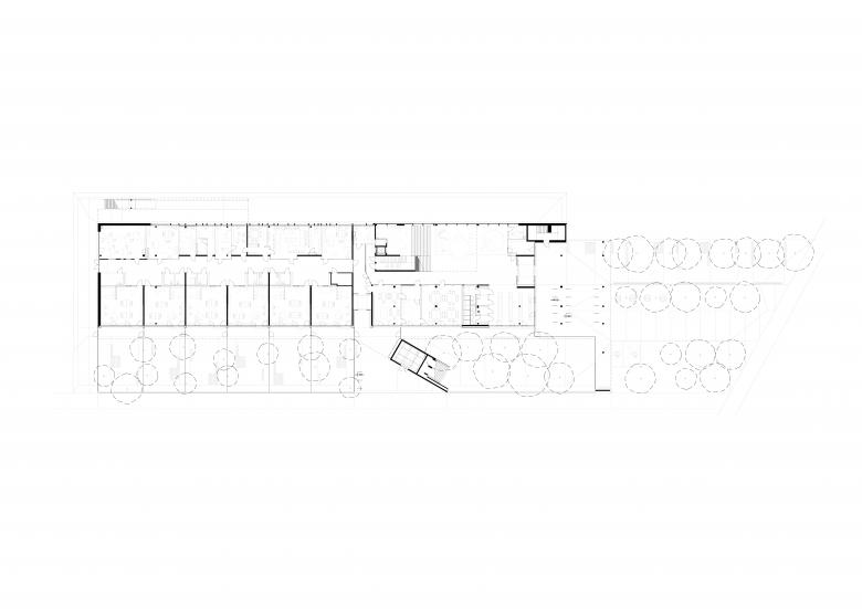 Die ASO wird in der westlichen Hälfte des Objektes erdgeschossig angelegt, der Eingangs- und Allgemeinbereich der VS und ZMS, sowie der Tagesbetreuungsbereich in der östlichen, zur Schulstraße hin orientierten Hälfte. Auf dem ersten OG befinden sich in der Westhälfte die Sonderunterrichtsräume mit südlicher Ausrichtung, sowie die Verwaltungs- und Lehrpersonalräume mit nördlicher Ausrichtung und der Turnsaal am Ende des Objektes. In der östlichen Gebäudehälfte sind die Räume für die ZMS angelegt, auf kurzem Wege direkt über der Haupteingangszone zu erreichen. Das zweite OG wird ausschließlich durch zwei gleichwertige Klassencluster mit den Lern- und Freiraumzonen bespielt. Auch hier sind - zum Teil mit einer Pergola überdeckte - großzügige Terrassenflächen vorgesehen.