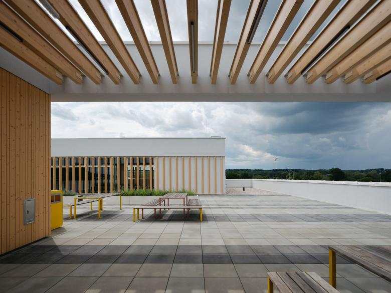 • Die Stufung der Funktionsebenen erzeugt großzügige Terrassen vor den Hauptunterrichtsräumen als möglichen Auslauf in den Pausen, aber auch als mögliche Freiklassen. Dies trifft auf alle drei Ebenen zu.