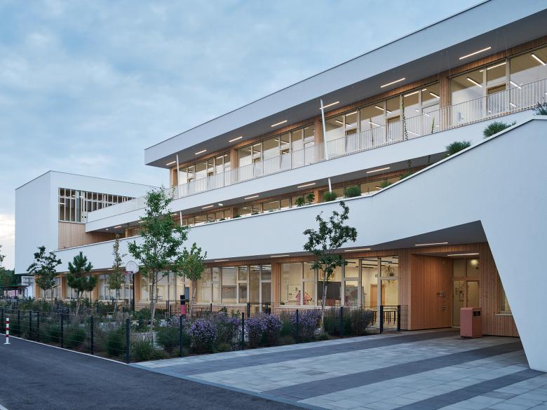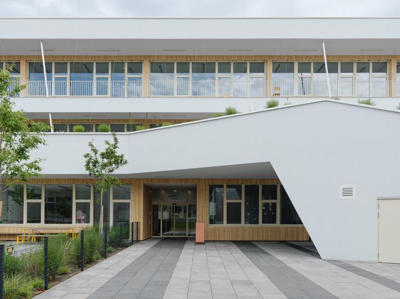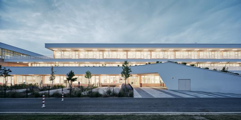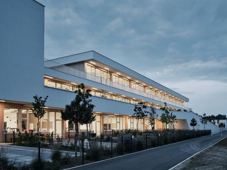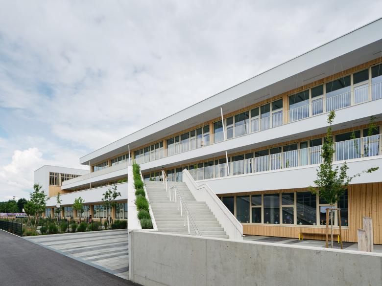 Die Fassade gegen Norden ist bis auf die Ausnahme der Öffnungen von der Aula zum Freiraum hin sparsam verglast und hocheffizient gedämmt. Die Südfassaden sind zum Teil großzügig, jedoch nicht über die gesamt Fläche verglast: Parapete sind als Holzsitzelemente ausgeführt. Als Sonnenschutz dienen die weit ausladenden Vordächer über alle Ebenen, sowie ein begrünter Fassadenschleier zur Erzeugung eines guten Mikroklimas. Ebenso sind im Bereich des Sichthorizonts außenliegende, zugleich lichtlenkende Raffstores in einem Teilbereich der Verglasung angedacht. Darüber hinaus sind erdgeschossig viele Bäume als Schattenspender vorgesehen, die jedoch im Winter wiederum genug Licht in die Unterrichtsräume lassen. Die Vorschläge folgen einer kalkulierten Logik im Zusammenspiel von ökonomischen und ökologischen Vorgaben des Auslobers.