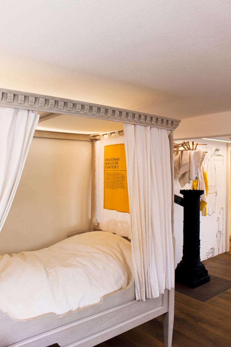 Sämtliche neu hinzugefügte Elemente sind schwarz-weiss gehalten und bilden somit einen eindeutigen Gegensatz zu den farbigen, historischen Möbeln.