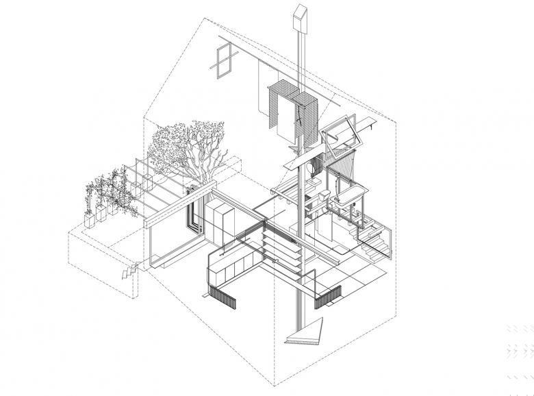 Dieses Konzept erlaubt die Konzentration der aufwändigen Interventionen auf die Hausmitte und eine äusserst effektive Sanierung aller Geschosse. Die Lage und Dichte der technischen Installationen an der Schnittstelle aller Räume prägt den architektonischen Ausdruck ebenso, wie die konsequent direkte Neuinterpretation der Fassadenöffnungen. So befindet sich die grösste Öffnung des Hauses überraschenderweise auf der Hangseite und öffnet das Raumkontinuum zum versteckten Garten – es erweitert den Innenraum um ein Aussenzimmer und ergänzt den Bestand mit neuen Qualitäten.