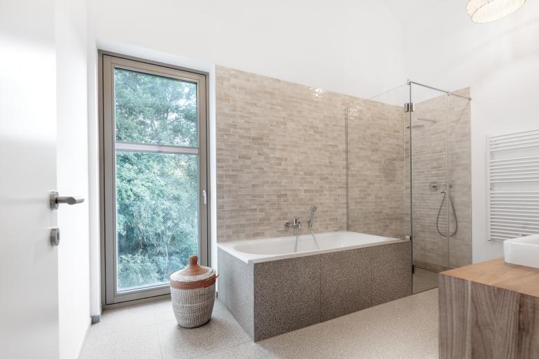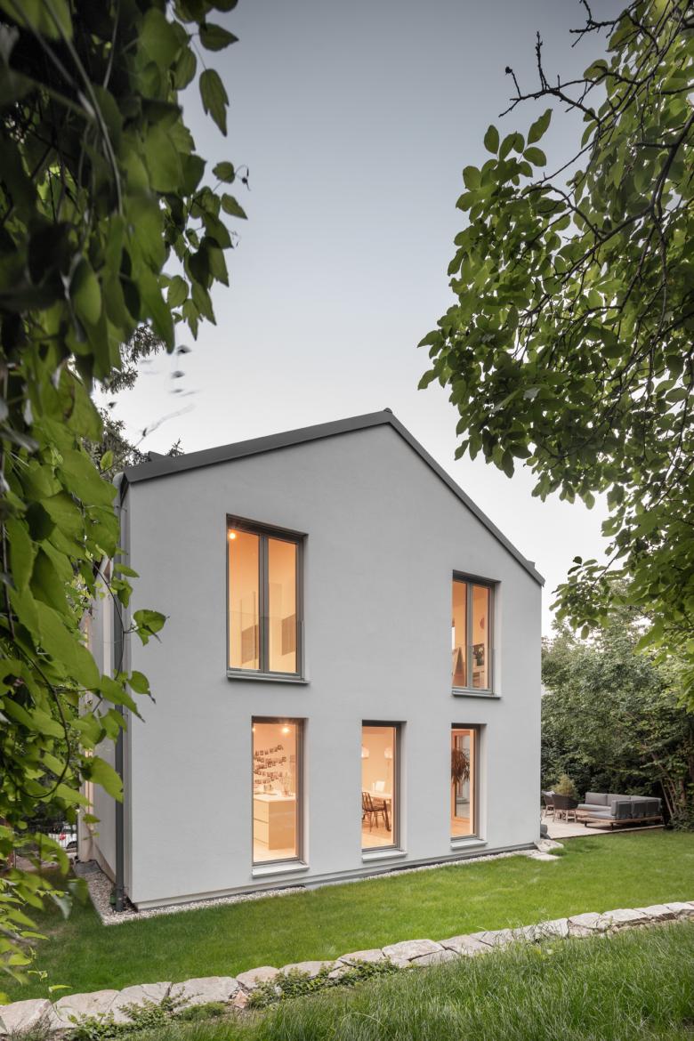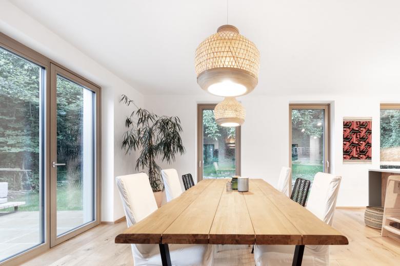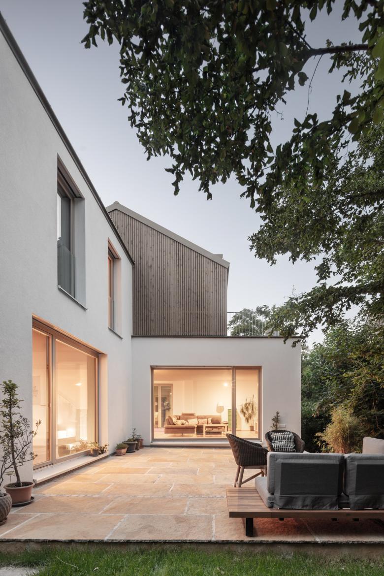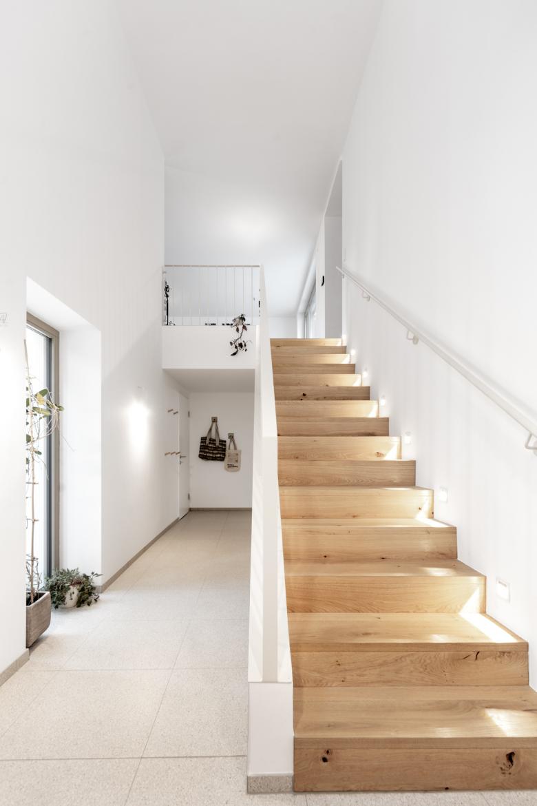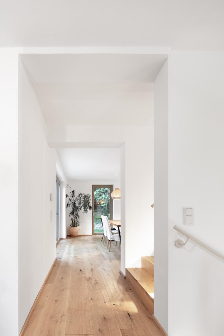 Das Haus wurde vollkommen umorganisiert. Das gelang vor allem durch die neue Positionierung der Stiege und die Aufteilung auf 2 nicht übereinanderliegenden Stiegenläufen. Dadurch betritt man nun das Haus mittels eines 2-geschoßigen hellen Entrees. Von dort führt die erste Stiege in den zentralen Wohnraum, welcher eine Verbindung mit der großen Wohnküche aufweist. Beide Räume sind mit großen Fenstertüren mit der Terrasse und dem Garten verbunden.