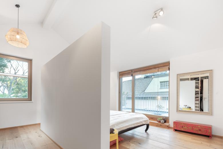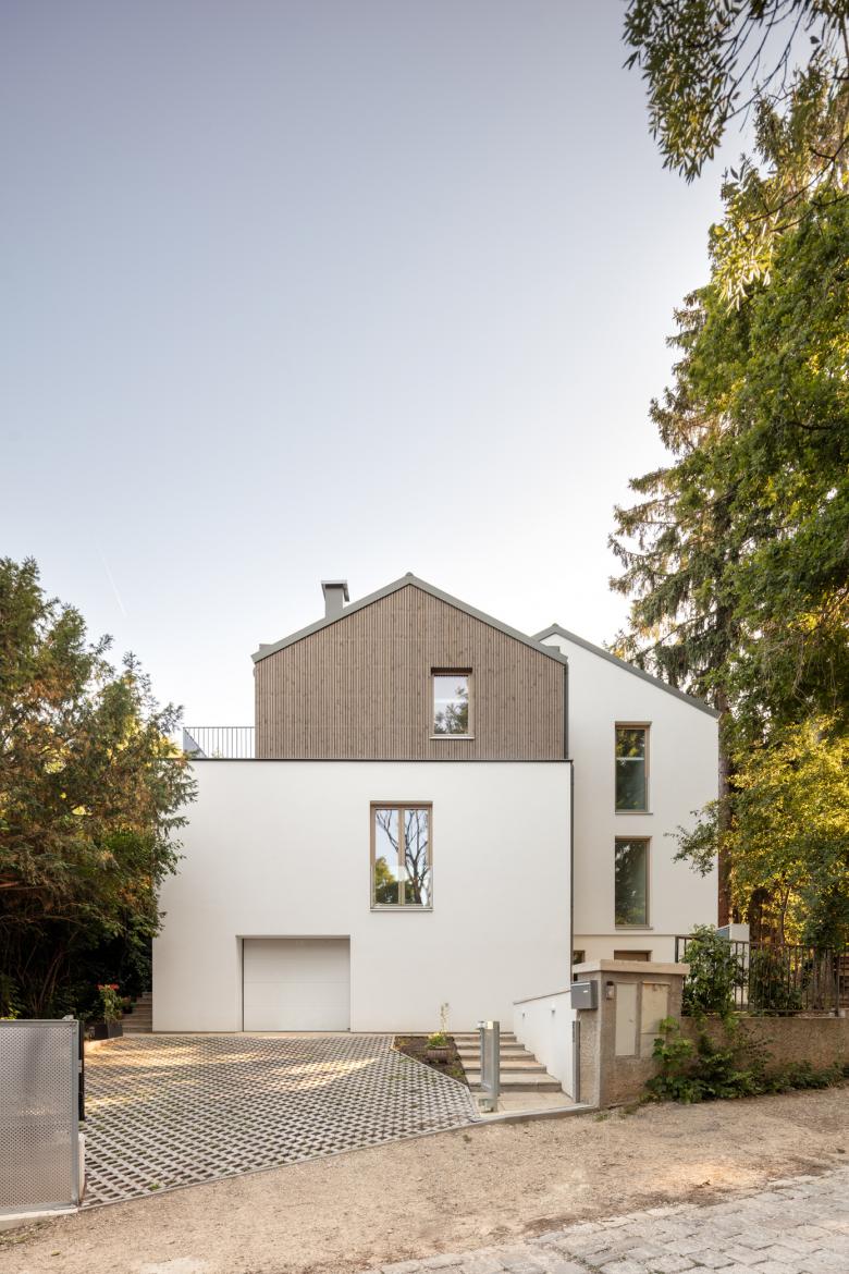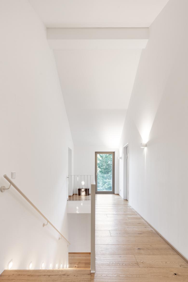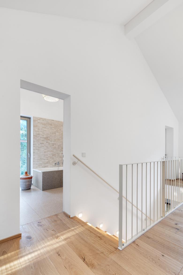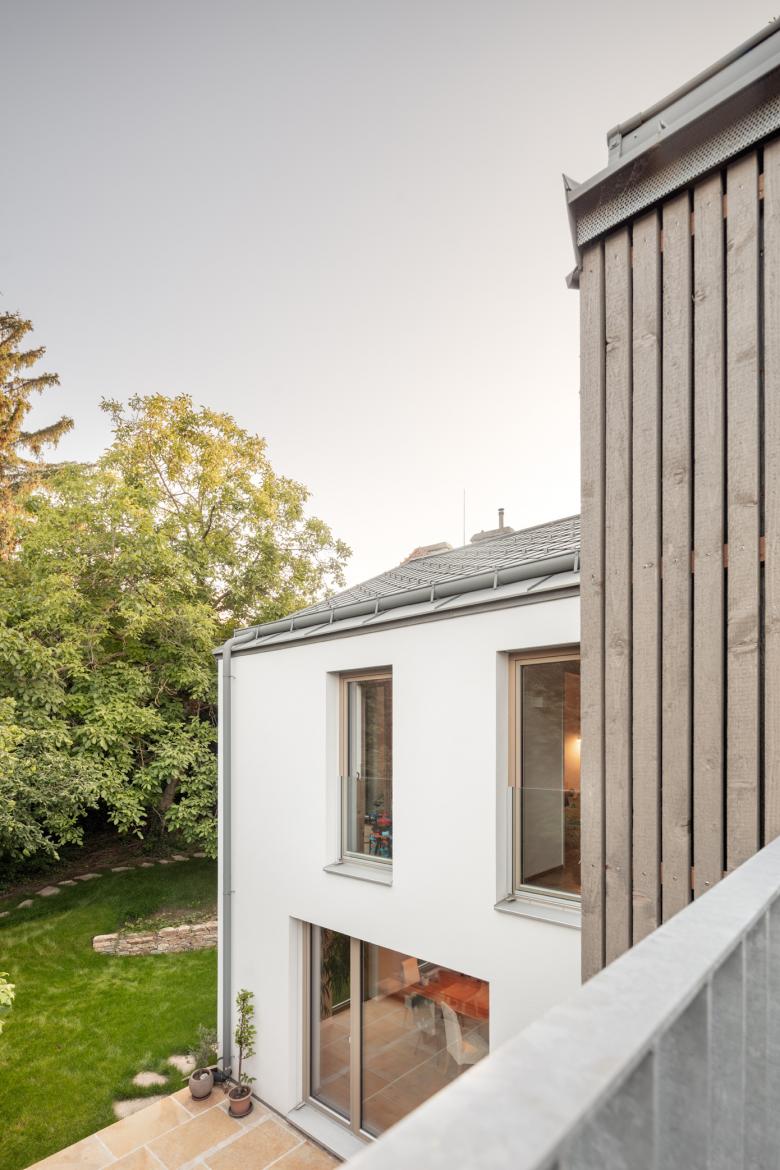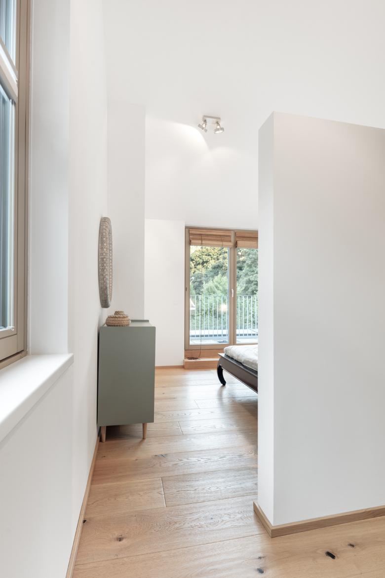 Die in das Obergeschoß, zu den Schlafräumen, führende Stiege befindet sich zwischen 2 Wandscheiben und bildet dadurch eine Zäsur zwischen dem Wohnbereich und dem privateren Obergeschoß. 2 Schlafräume orientieren sich mit französischen Fenstern zum straßenabgewandten Garten; das große Elternschlafzimmer hat eine nach Osten orientierte Terrasse. Der Umbau bleibt im Grundriss in den Abmessungen des Bestandes. Im Obergeschoß wurde aber der Dachstuhl gehoben und neu errichtet. Der Bereich des Elternschlafzimmers wurde, anstelle eines sehr niedrigen Dachbereiches, als zurückgestaffelter Holzbau neu aufgesetzt.