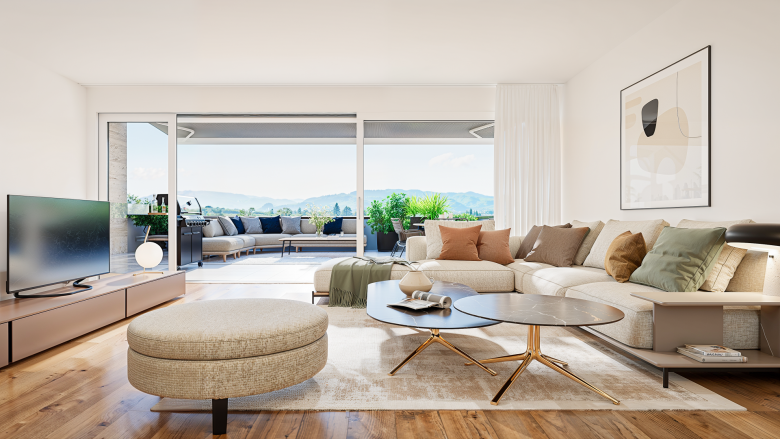 Die Einfamilienhäuser sind in zwei Typen mit je individuellem Wohnangebot gegliedert – wobei alle Häuser über eine grosszügige Dachterrasse im Attikageschoss, einen Garten im Erdgeschoss und eine eigene Doppelgarage verfügen. Je nach Haustyp liegen die Wohnräume entweder auf dem Erdgeschoss mit direkter Anbindung zu Sitzplatz und Garten oder aber die Wohnräume sind im Attikageschoss angeordnet und öffnen sich hin zur Dachterrasse mit ihrem spektakulären Weitblick.