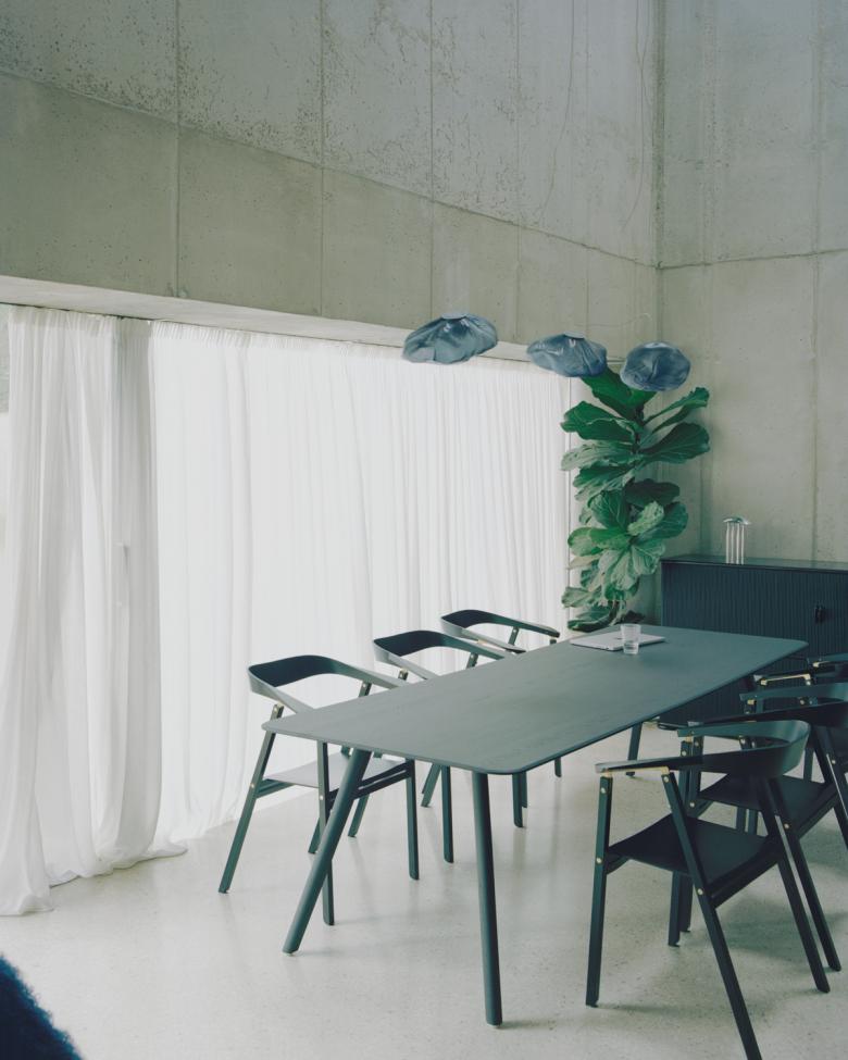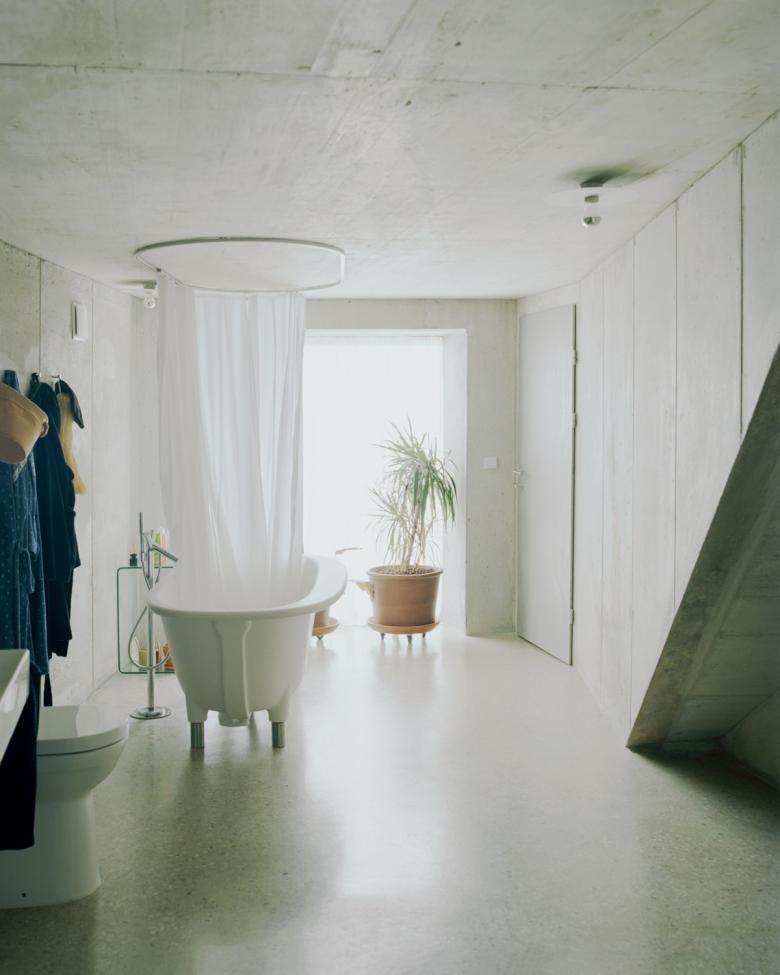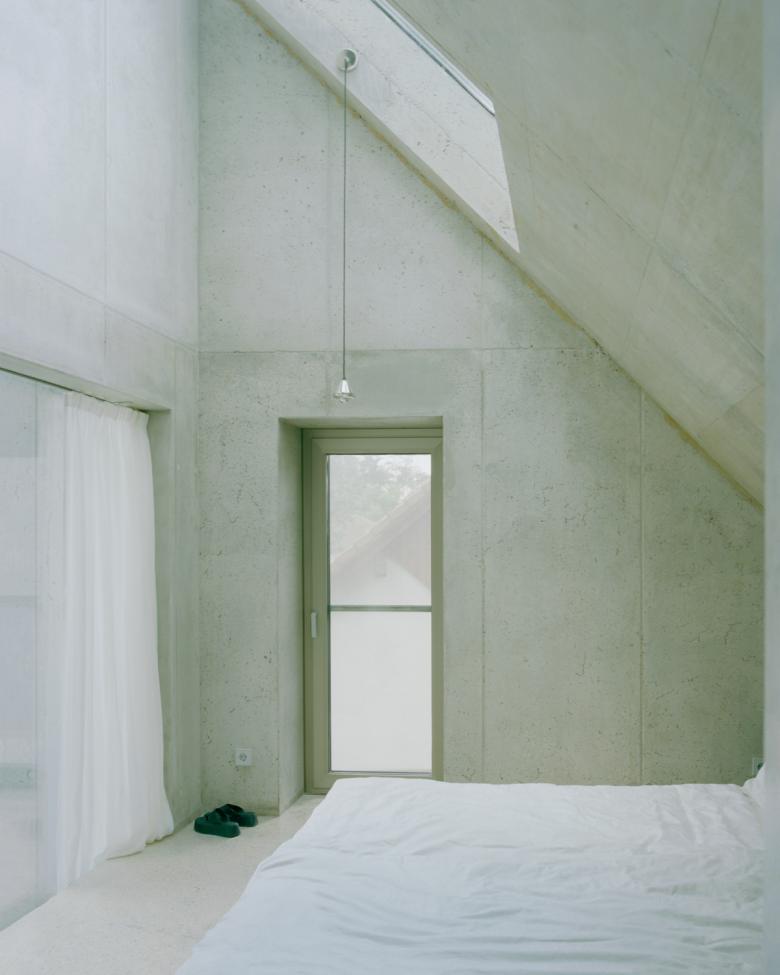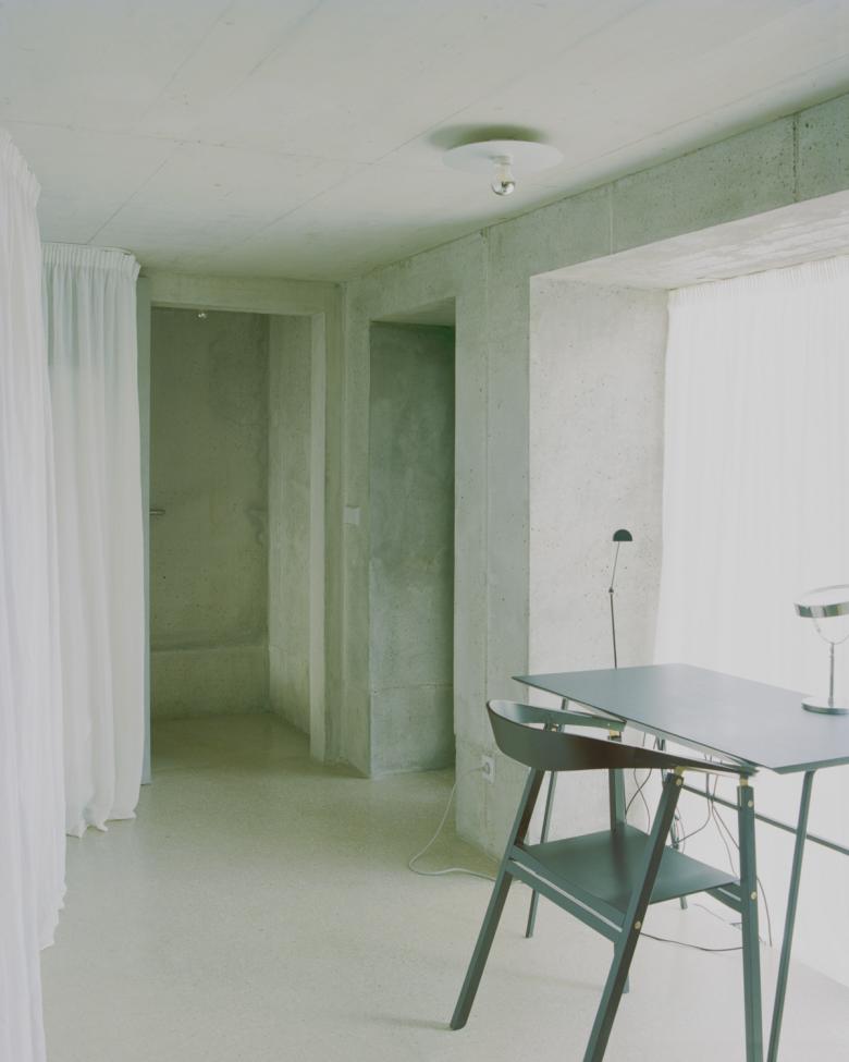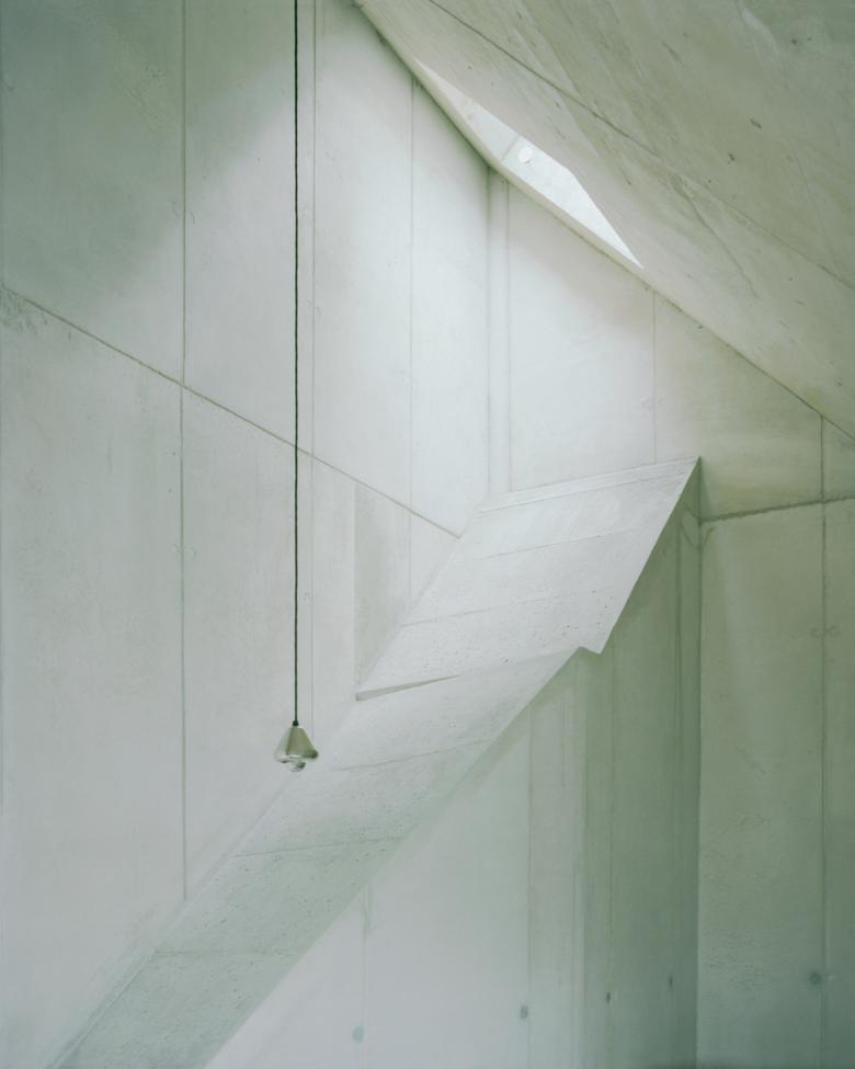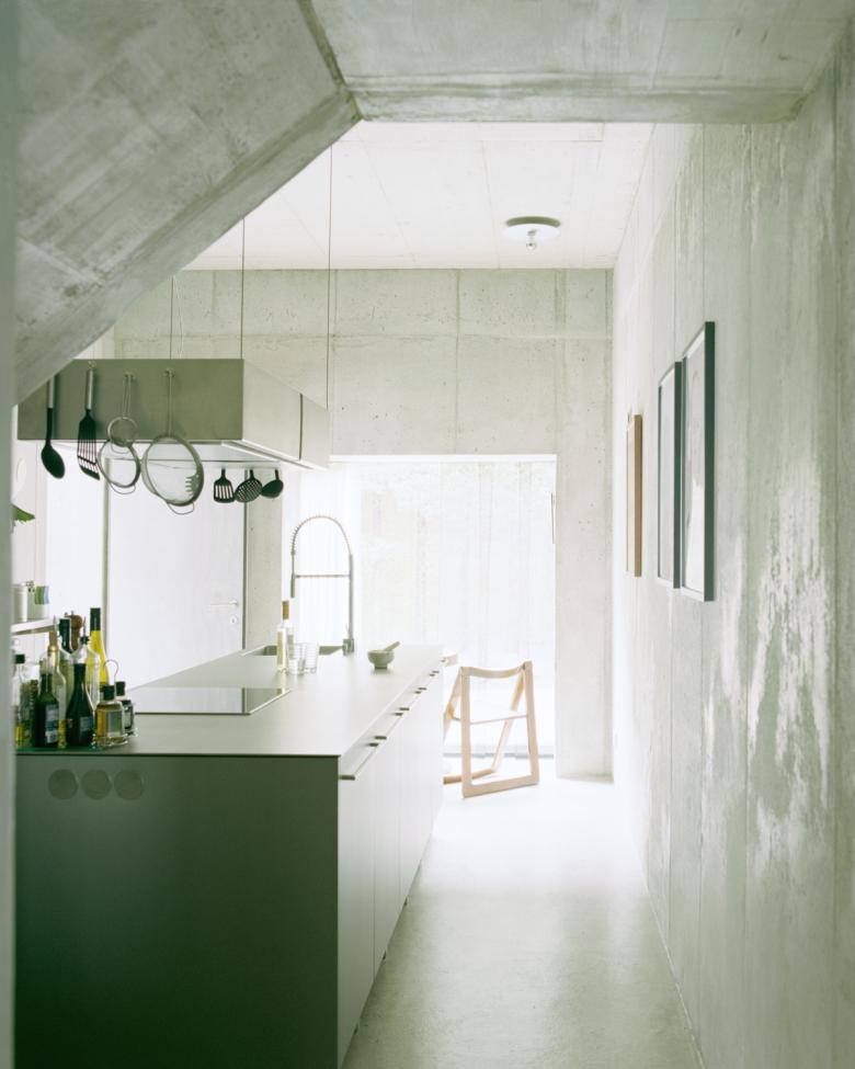 Eine dicke Außenwand aus Dämmbeton umschließt das Volumen. Sie ist roh belassen, ohne Putz, ohne Schichten. Innen und außen sind aus demselben Material. Das Haus atmet durch seine Masse und reguliert die Temperatur nicht über Technik, sondern über seine Substanz. Der Garten auf der Rückseite ist nur über das Haus zugänglich. Er ist kein Rückraum, sondern ein Gegenüber – ein stiller Gegenpol zur vorbeiziehenden Straßenbahn. Eine Mauer fasst ihn ein und macht ihn zum zweiten Innenraum. Im Zentrum des Hauses öffnet sich ein hoher Raum: Er ist fast zwölf Meter lang, über zehn Meter hoch und kaum breiter als ein Flur. Er ist leer, aber bildet das räumliche Herz, aus dem sich alles Weitere entwickelt. Jeder dieser sechs Räume ist gleich geschnitten, doch durch die wechselnden Raumhöhen differenziert. Die spezifischen räumlichen Qualitäten schaffen unvorhersehbare und vielfältige Möglichkeiten der Aneignung der nutzungsneutralen Zimmer. Zwei Treppen, die zu einer doppelten Spirale verschränkt sind, erschließen die Räume zur Gleisseite. Die Schalterserie LS 990 in Alpinweiß begleitet diese Architektur mit leiser Selbstverständlichkeit.