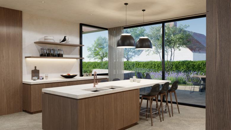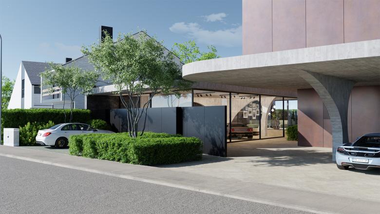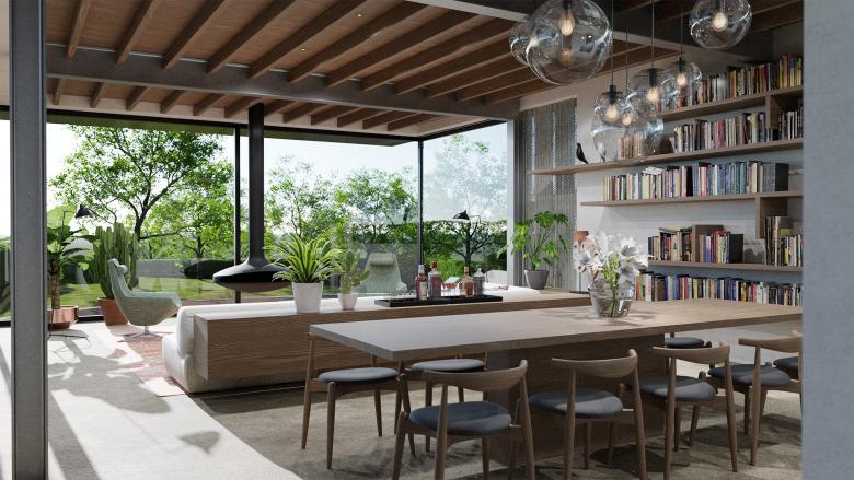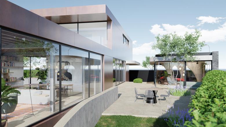 Simple materials such as timber boards, cast concrete, and patinated red copper lend a restrained yet characterful unity to the design. The home’s geometric rectangular form is softened by organic curves in the outdoor spaces, creating a beautiful harmony between the built and natural environment.