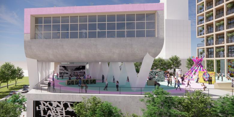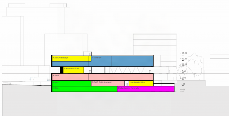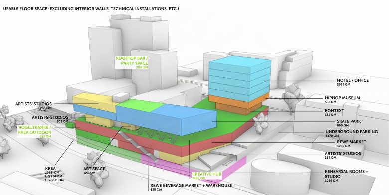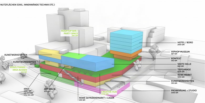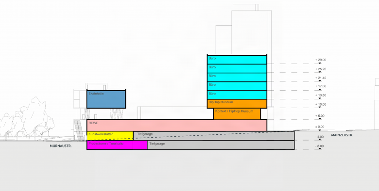Das städtebauliche Konzept sieht einen hybriden Gebäudekomplex mit differenzierter Architektursprache und vielfältigen Nutzungen vor: Zur Mainzer Straße orientiert sich ein prägnanter Büroturm mit einer zeitgemäßen, nachhaltigen Architektursprache – als sichtbares Zeichen für CO₂-reduziertes Bauen und den Innovationsgeist der Stadt: Holzhybridbauweise, lokale Energiegewinnung, Fassadenbegrünung und Dachgarten. Hier entstehen moderne Loft-Büros, ein Hotel sowie ein Hip-Hop-Museum im Erdgeschoss. Die Kulturbauten auf der Rückseite greifen die Ästhetik industrieller Baukultur auf – roh, wandelbar und offen für Aneignung. Ihre reduzierte Formensprache bietet Raum für kreative Nutzung, künstlerische Experimente und flexible Entwicklungen. Vorgesehen sind eine Skatehalle, ein multifunktionaler Veranstaltungssaal für Konzerte, Workshops und Clubnächte, Proberäume, Künstler:innenateliers, Rooftop-Bar, eine Art Gallery sowie öffentliche Freiflächen für kulturelle Aktivitäten. Im Erdgeschoss verbindet eine großflächige Einzelhandelszone die Gebäudeteile baulich miteinander. Darüber entsteht ein erhöhter Stadtplatz – das lebendige Herz des Campus und Bühne für Kunst, Musik und Begegnung. So entsteht ein vielschichtiges Geflecht aus Kultur, Kreativität, Arbeit, Handel und Freizeit – ein offener Ort, der neue Impulse für das urbane Leben der Stadt setzt. Über seine programmatische Vielfalt hinaus versteht sich der Kulturcampus Wiesbaden als architektonisches Statement: Ein neues modernes Wahrzeichen am Stadteingang – Symbol für ein offenes, lebendiges und zukunftsorientiertes Wiesbaden.