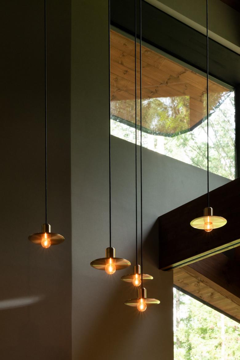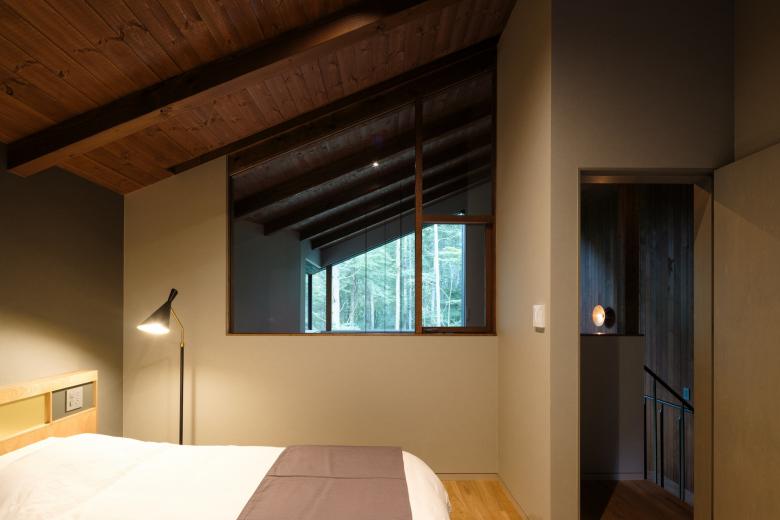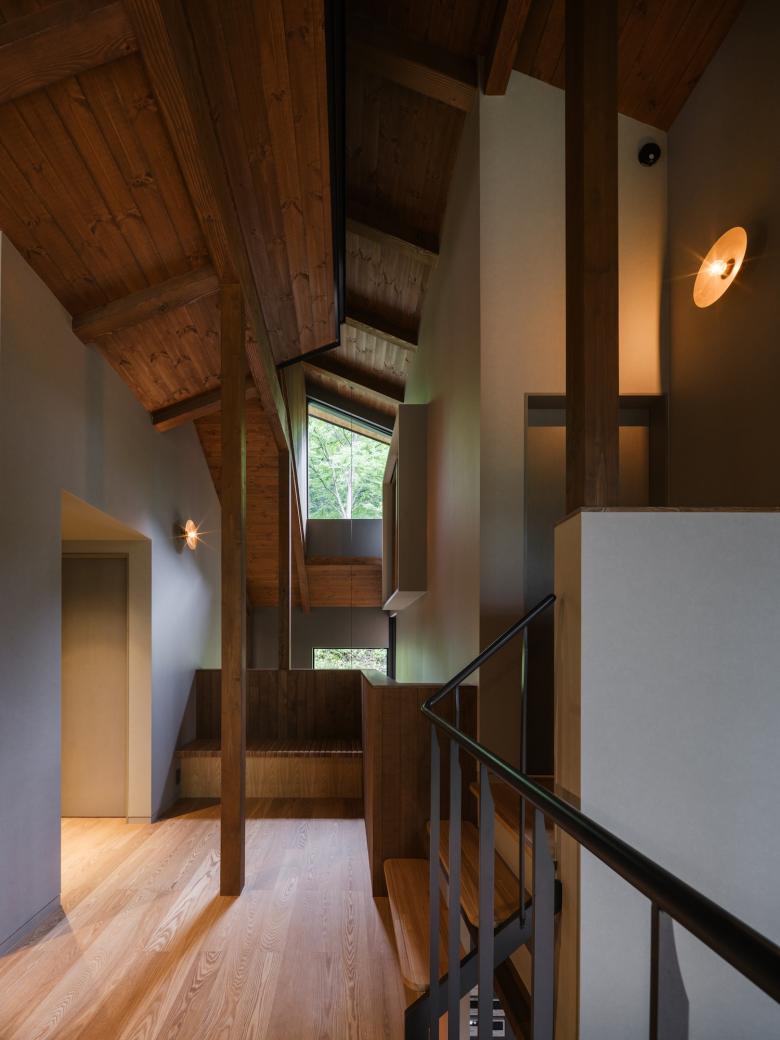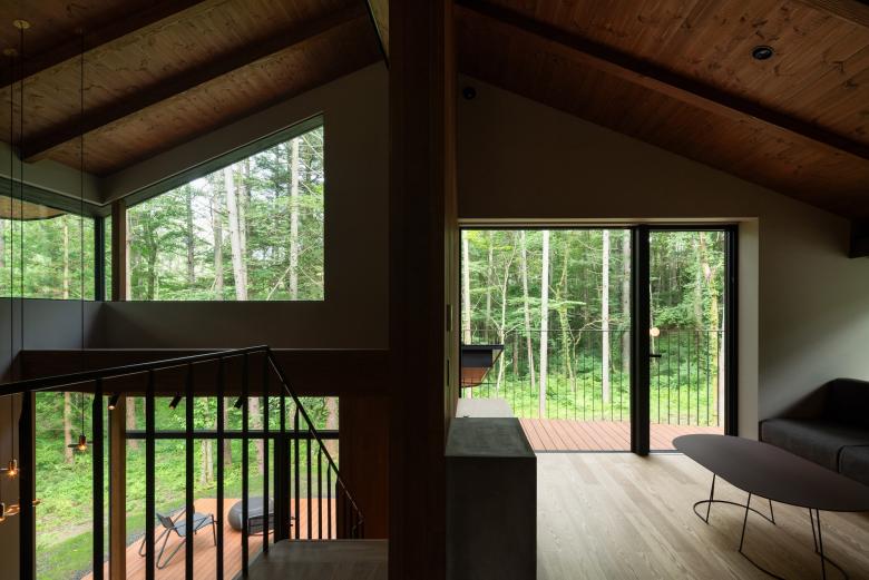 ダイニングスペースと目の前の林を吹き抜けに開けた複数の開口部でつなぎ、林に囲まれて過ごす。おちついた小ぶりのラウンジと2階レベルの林の広がりを横並びの二つの開口部とテラスによって水平につなぎ、ツリーハウスのような居心地を感じる。玄関と木々の樹冠を高い吹き抜けとハイサイドライトでつなぎ、林の中にすっぽりと入り込む、と言った具合に。