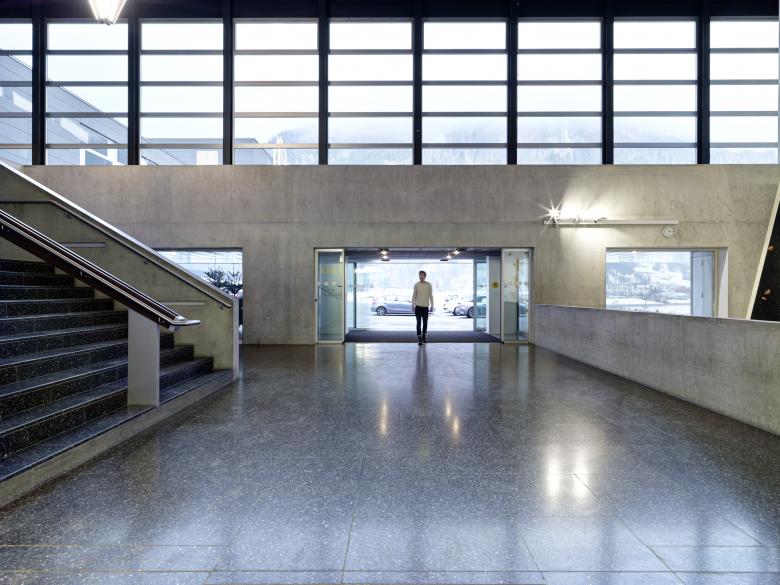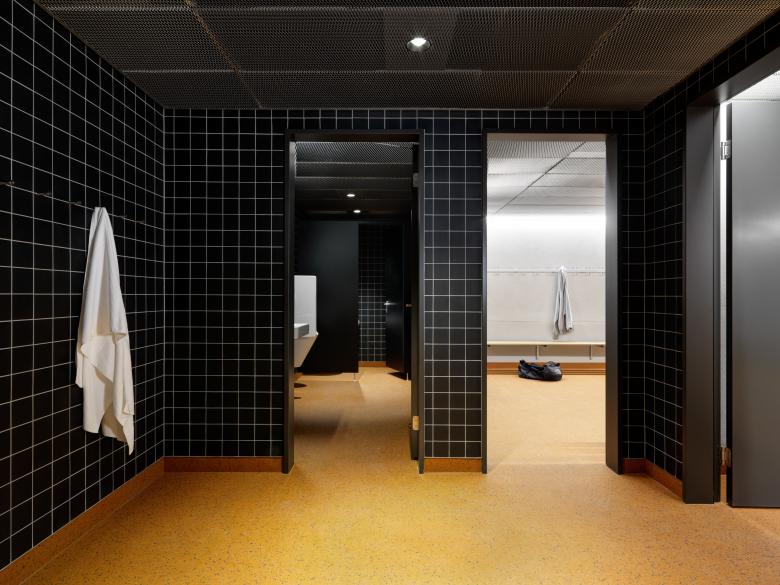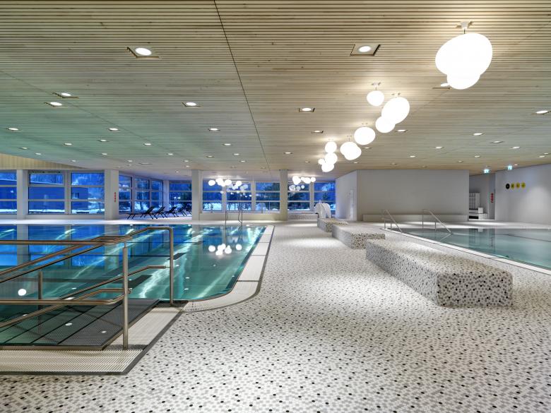 Innerhalb des Bestandes konnte der zentrale Umkleidebereich modernisiert und die enge Raumstruktur zugunsten eines flexiblen Wechselgarderoben-Systems aufgelöst werden. Mit der Öffnung des Haupteingangs in Richtung des Parkplatzes und der Neuorientierung des Kassenbereichs im 1. Obergeschoss hin zur Treppe wurde die Wegleitung für den Besucher offensichtlicher gestaltet. Durch eine Restrukturierung des Bestandes konnten ausserdem sieben moderne Mehrbettzimmer als Erweiterung des Übernachtungsangebots umgesetzt werden.