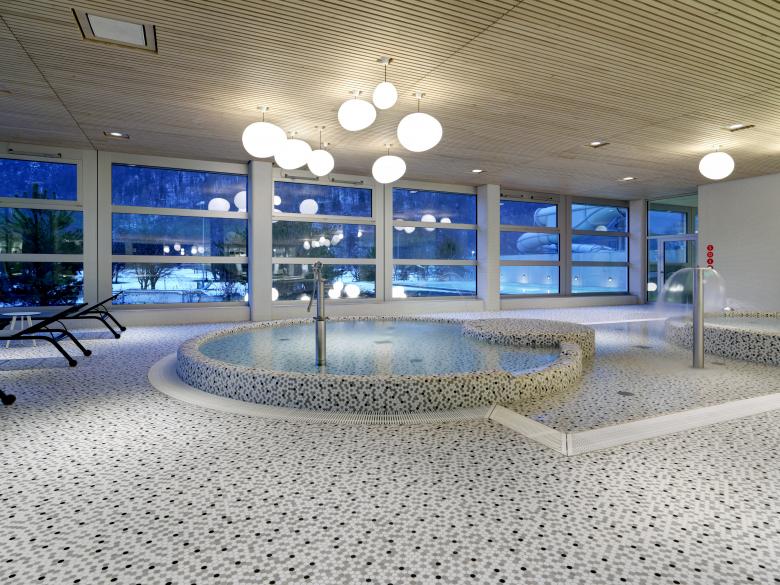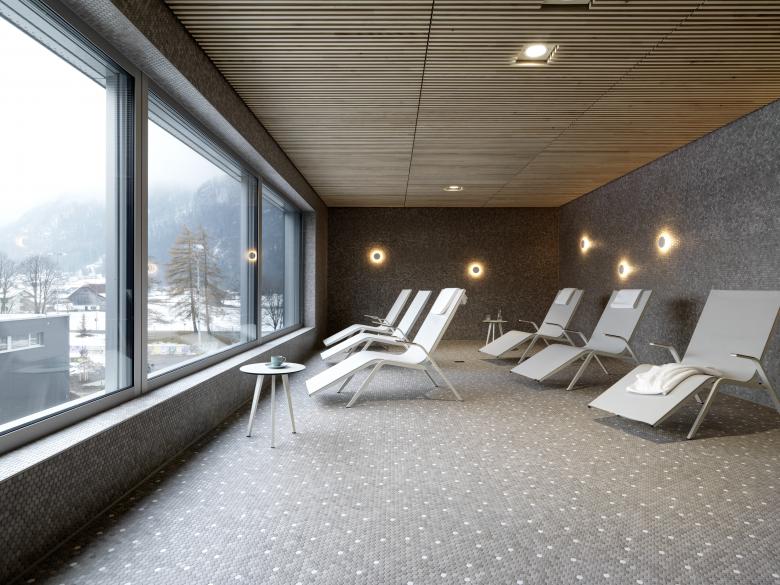 Ein neuer Längsbau vereint geschickt viele der neuen Bausteine. Neben der Infrastruktur für eine aussenliegende Rutsche, dem Zugang zum neuen Warmwasser-Aussenbecken befindet sich hier auf dem Hallenbadniveau ein neuer Kinderplanschbereich. In den zwei oberen Geschossen des Anbaus sind eine attraktive Wellness-Anlage mit Aussenbereich sowie ebenerdig, und so vom Parkplatz direkt zugänglich, neue Fussball-Garderoben realisiert worden.