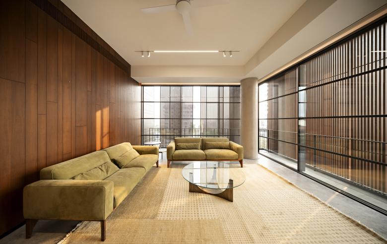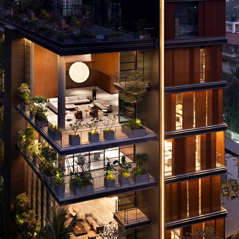 This building is a reconstruction of one of these original multi-generational family homes in Juhu. Our intention here was to allow this development to take the stage as new, whilst drawing on the original charm of Bombay balconies and outdoor living. The interiors, in noble materials, have been personalised for each family member and their respective art collections. A collective life of understated luxury and elegance.