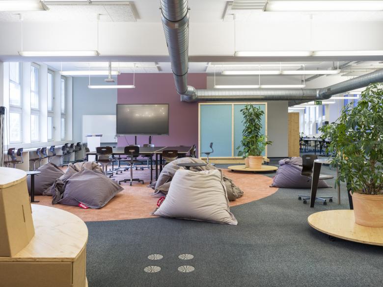 Um die neue Sicht und Herangehensweise an den Schulalltag räumlich umzusetzen wurde eine multifunktionale, flexibel nutzbare, kreativ und doch zweckmässig gestaltete Lern- und Arbeitsumgebung entwickelt. Das Lernen in grösseren Gruppen, das Arbeiten in Teams sowie das individuelle, selbstorientierte Lernen soll situationsgerecht und bedürfnisorientiert ermöglicht werden. Räumlich wird der Aspekt des mehrdimensionalen Lehrens und Lernens durch eine Landschaft mit unterschiedlichen Zonen erzeugt.