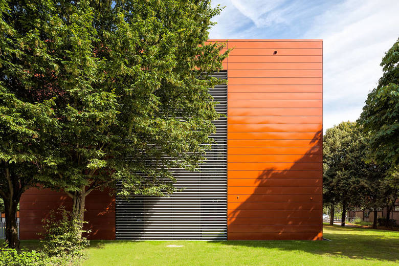 Die Kopffassade im Süden wird durch die geschossübergreifende Lamellenstruktur flächig und großzügig gestaltet. Die gebänderten terracottafarbenen Metall-Fassadenpaneele nehmen in ihrer Farbgebung Bezug zu den bestehenden Gebäuden, binden somit den Modulbau weiter in sein Umfeld ein.