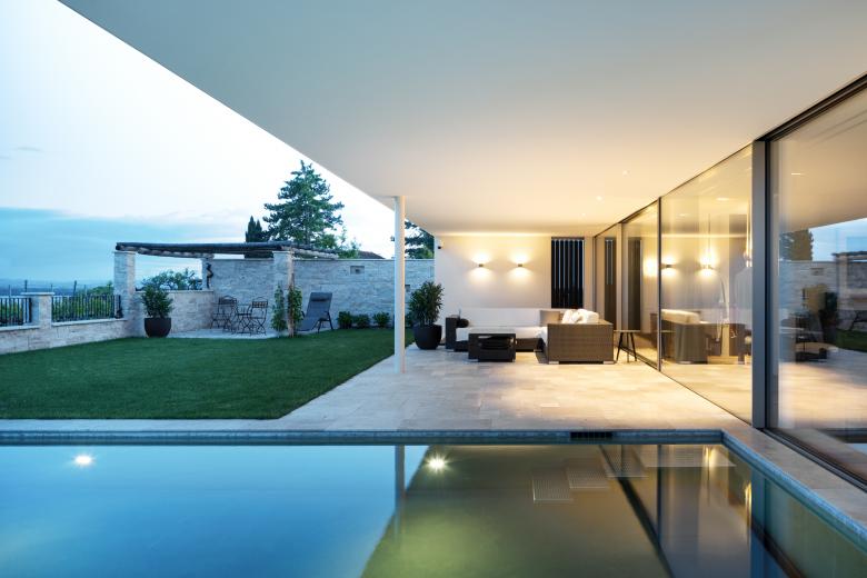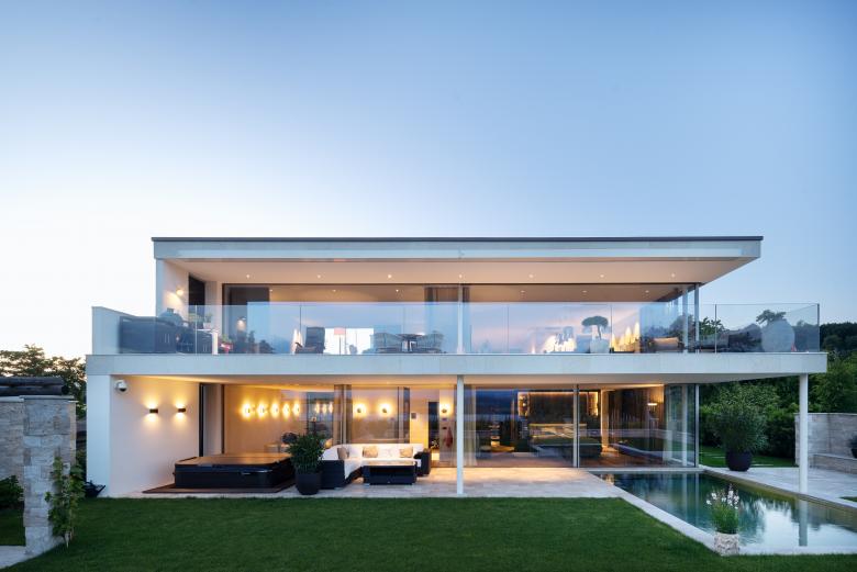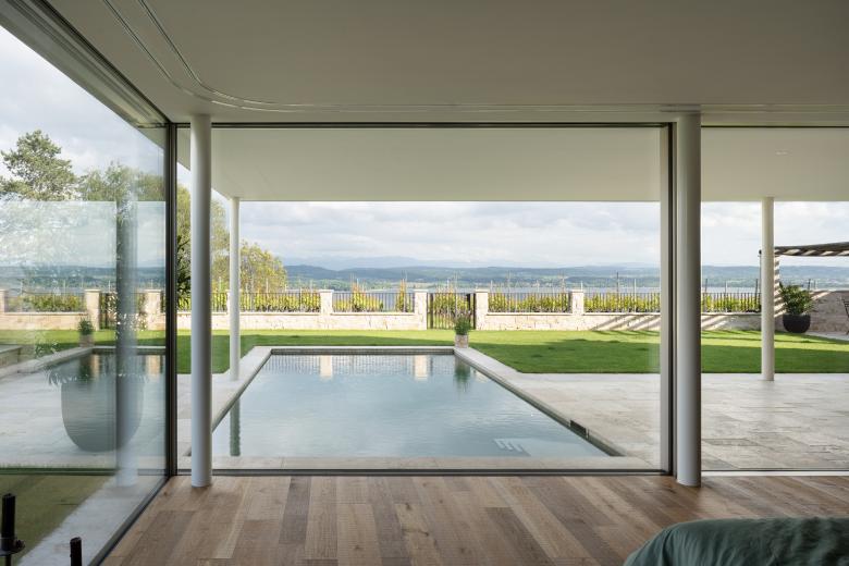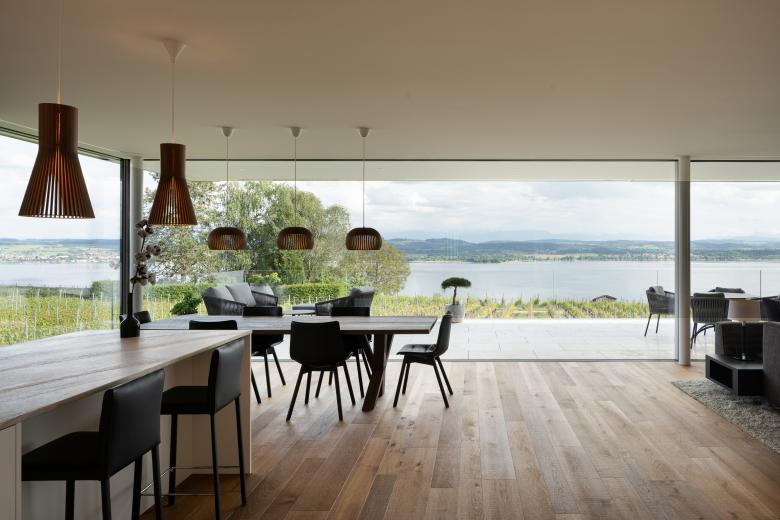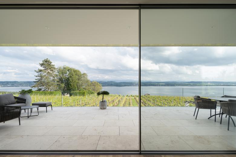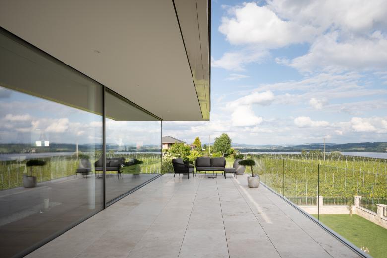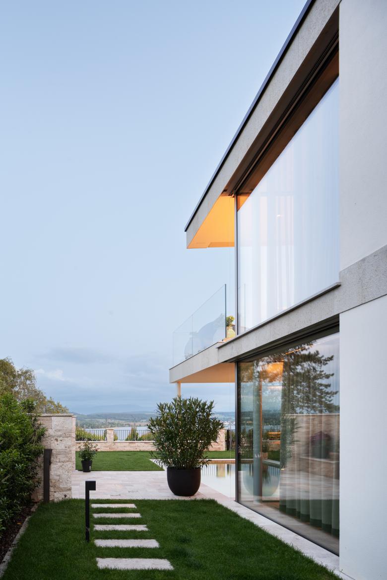 Die moderne Villa am Mont-Vully überzeugt durch klare Linien, grosszügigen Verglasungen und eine transparente Architektursprache. Rahmenlose Schiebefenster öffnen das Haus zur Natur hin und schaffen ein unvergleichlich offenes Wohnerlebnis.