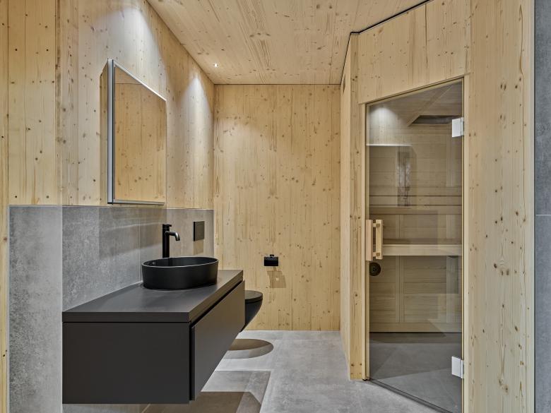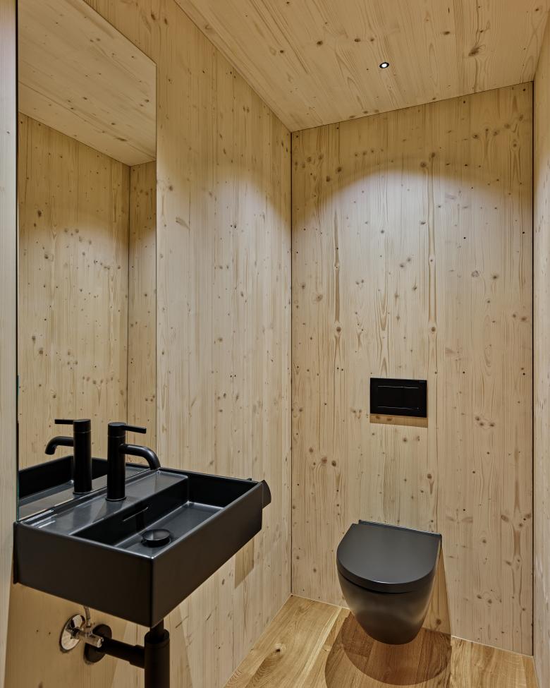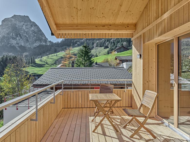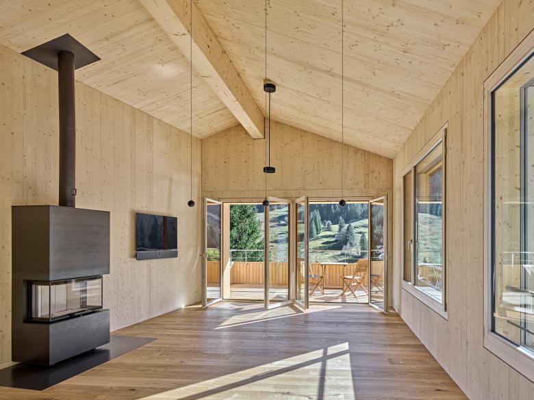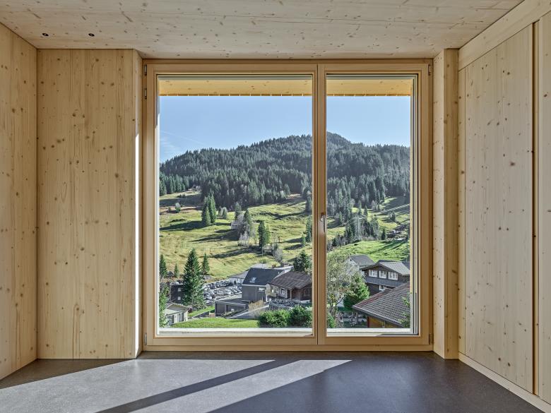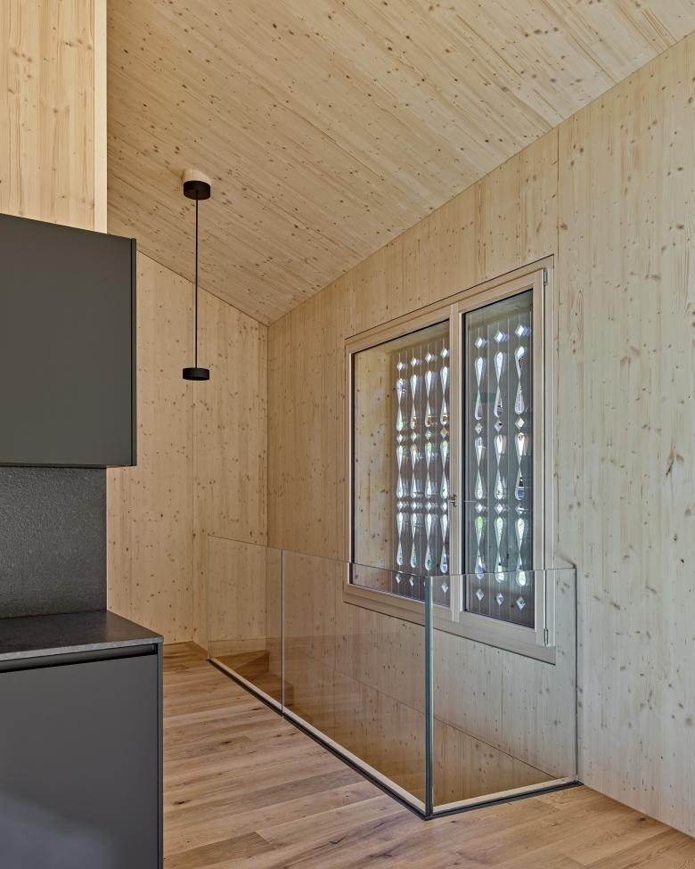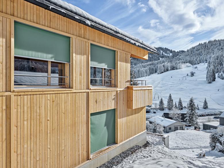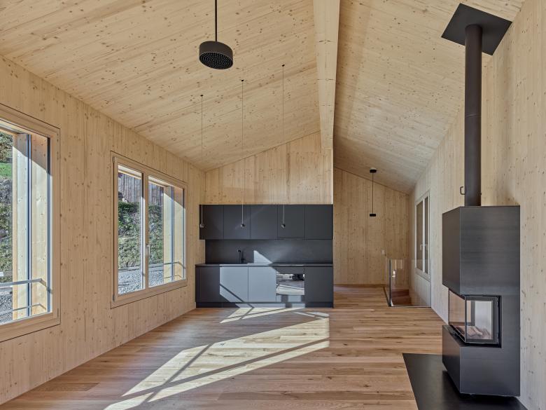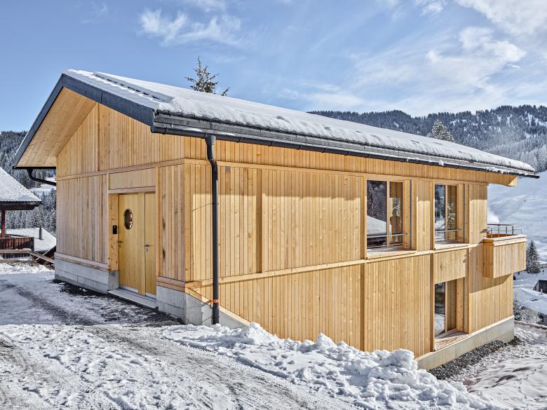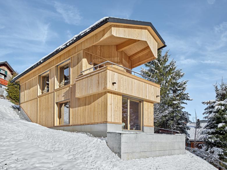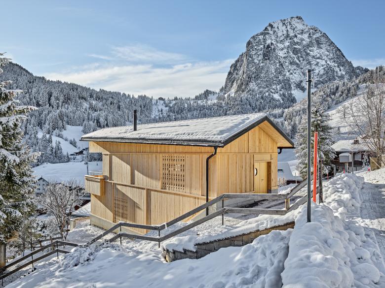 Ein bestehendes Ferienhaus im Skigebiet Alpthal auf 1’120m.ü.M. mit Blick auf den Grossen Mythen soll ersetzt werden. Trotz seiner attraktiven Lage ist die schmale Form der Parzelle und die anspruchsvolle Topografie mit starker Hanglage eine grosse Herausforderung für die Planung. Daher leitet sich die Gebäudeform aus den Grenzabständen und der schmalen bebaubaren Fläche mit 5.5m bis 6.5.m ab. Das Wohnhaus ist zweigeschossig mit Wohn- Essraum und Balkon im Eingangsgeschoss und den Zimmern mit Bad und Sauna im Untergeschoss. Die Vorfertigung der Holzelemente für Wände, Decken und Dach ermöglichte die verkürzte Bauzeit von April bis Oktober.