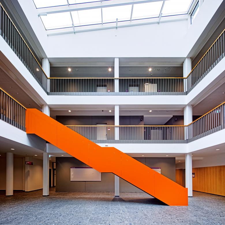 Über den Haupteingang gelangt man in das Foyer des Gebäudes, das mit dem lichtdurchfluteten Atrium einen zentralen Kommunikations- und Interaktionsraum bildet. Offene Arbeitsplätze mit unterschiedlichen Aufenthaltsqualitäten sind sowohl um das Atrium als auch auf den Galerien in den Obergeschossen angeordnet. Die zentralen Hörsäle, Seminar- und Multifunktionsräume werden ebenfalls von dort erschlossen. Das Herzstück, die Bibliothek, die sich über zwei Geschosse erstreckt, wird durch ein großzügiges Glasdach mit Licht durchflutet.