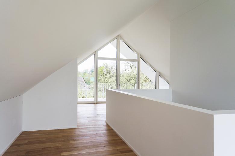 Die Parzelle befindet sich an erhöhter, ruhiger und sonniger Lage am Dorfrand von Esslingen. Die Qualitäten des Grundstücks werden massgeblich durch die Topographie und die südöstlich angrenzende Freifläche bestimmt. Während man im Erdgeschoss vom unmittelbaren Gartenbezug profitiert, eröffnen sich aus dem Dachgeschoss attraktive Blicke über die Obstbäume hinweg Richtung Voralpen. Die beiden zu erstellenden Wohneinheiten sollen maximal von den Qualitäten des Ortes profitieren. Daraus und aus den baurechtlichen Rahmenbedingungen entstanden zwei ineinandergeschobene „Häuser“. Die Wohnungen werden über 3 Geschosse organisiert, wobei jedes Geschoss seinen eigenen Charakter hat: Das Erdgeschoss als offener Grundriss um einen mittigen Kern mit raumhohen Fensteröffnungen über Eck, das Obergeschoss als introvertiertes Geschoss mit den Schlafzimmern und der Dachraum als offener, erweiterter Wohnraum mit vollverglasten Giebelfassaden. Die hausinterne Erschliessung wird als Weg durch das Gebäude verstanden, welcher die verschiedenen Ebenen visuell miteinander verbindet. Von aussen soll das Gebäude als skulpturaler Körper in Erscheinung treten. Aussenwand und Dachfläche werden als Einheit wahrgenommen. Der dunkle Farbton verleiht dem Gebäude eine edle Ausstrahlung und erzeugt einen schönen Kontrast zum weissen Innern.