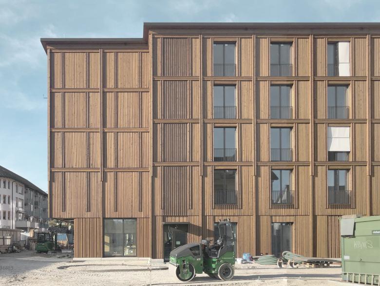 Das Gebäude ist so strukturiert, dass es auch in Zukunft flexibel nutzbar ist. Entsprechend ist die Fassade aus vorfabrizierten Holzelementen nichttragend ausgebildet. Auch aussen ist das Gebäude mit Holz verkleidet, einem Material das bei den volketswiler Häusern traditionellerweise eine Rolle spielte. Diese Materialisierung trägt gleichzeitig zum einladenden und wohnlichen Charakter der Anlage bei.