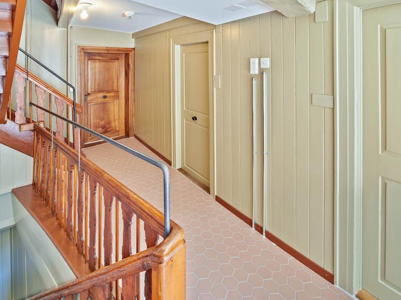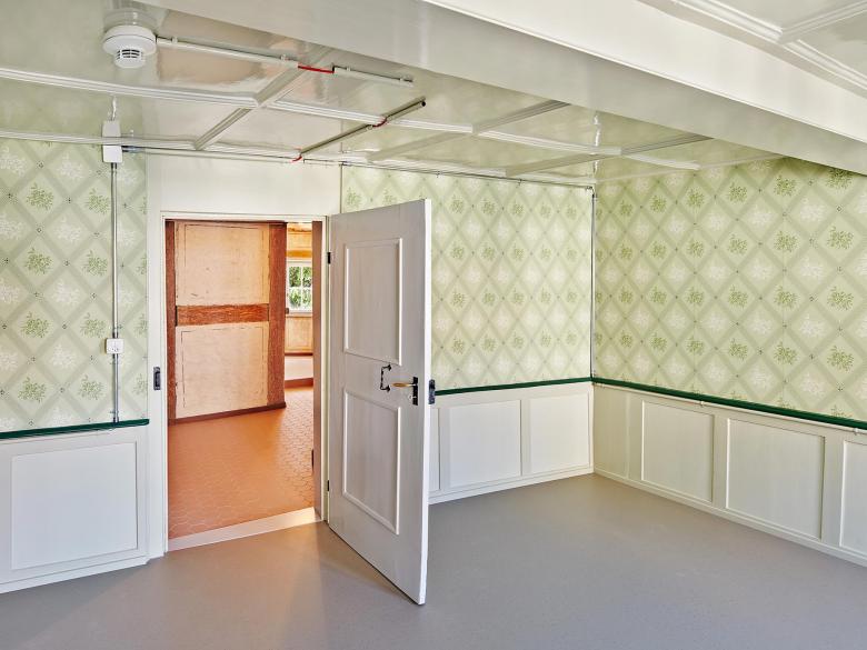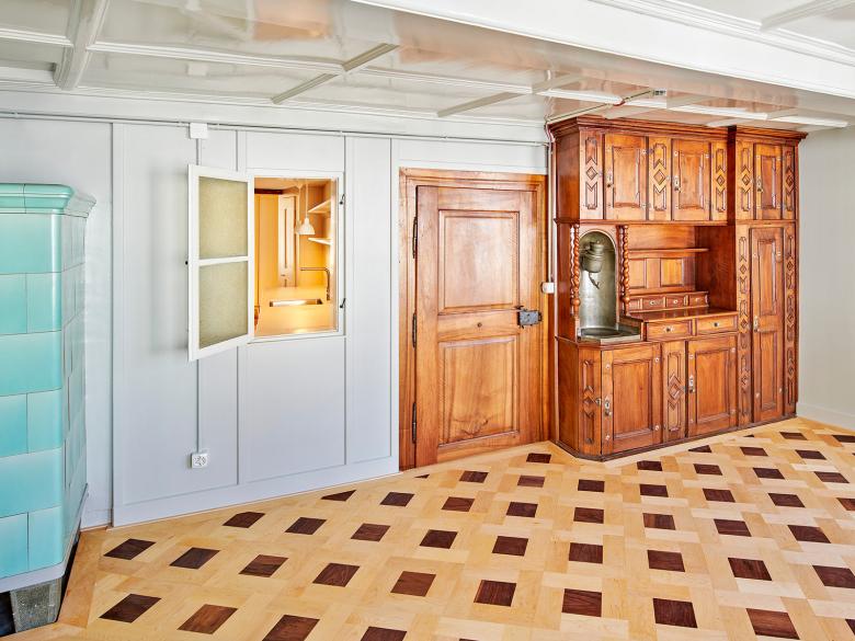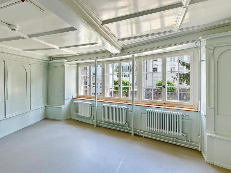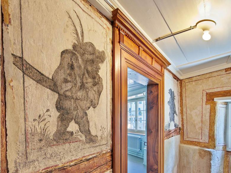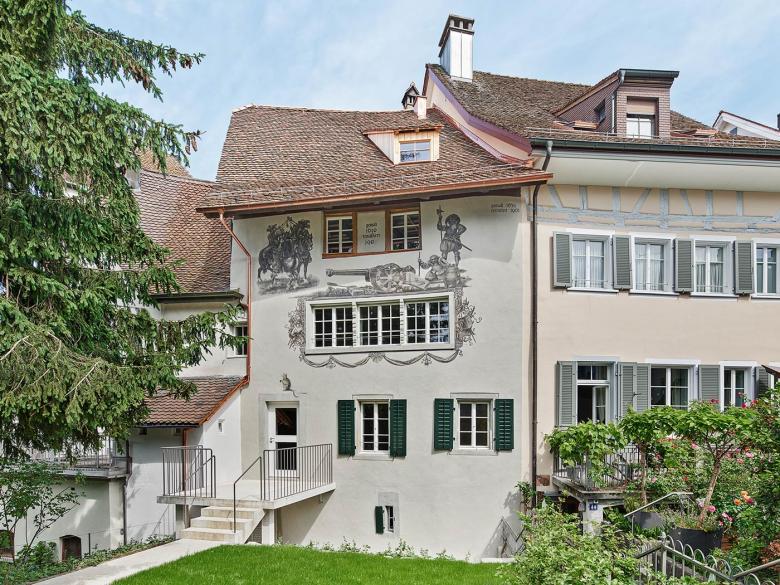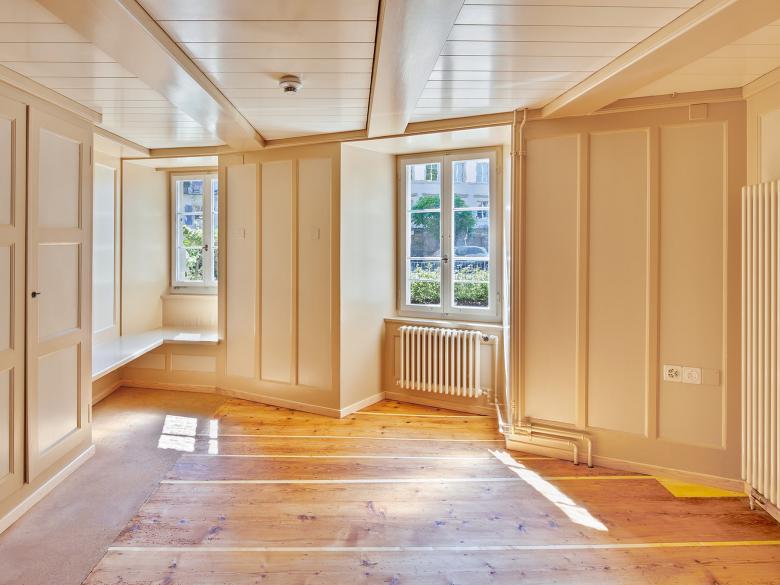 Aufgrund der feuerpolizeilichen Auflagen legte die Bauherrschaft das denkmalgeschützte Haus der Keiser-Pfründe weiterhin als eine Einfamilienhaus-Nutzung fest. Neu ist das Dachgeschoss auszubauen und das Haus als Wohngemeinschaft zu nutzen. Wir entwickelten für das dreiraumtiefe Gebäude ein Nutzungskonzept mit je zwei Schlafzimmern und dazwischen einem gemeinsamen Badezimmer für das Dach- und die Obergeschosse. Im Erdgeschoss liegt wie historisch überliefert, zentral die Küche mit anschliessendem Esszimmer und seeseitig die Wohnstube. Das Steildach erhielt auf der Seite Grabenstrasse eine historisch angelehnte Schleppgaube, seeseitig repräsentieren zwei filigran profilierte Quergiebellukarnen die Dachlandschaft. Die Kanonenszene an der Fassade wurde mit historischen Produkten gesichert. Der ehemalige Stadtgraben wurde mit Kürzung von Mauern und einer Abgrabung von Füllmaterial stärker sichtbar gemacht. Den Hauseingang verlegten wir zurück in die Altstadtgasse, wo dieser im Sandstein gerahmten Gewände und der massiven Holztüre seine Repräsentation findet. Den aufgehobenen Eingang wandelten wir in einen neu erstellten, fast schwebenden Balkon aus beigem Jurabeton um. Aufgrund von Material- und Farbbefunden gestalteten wir die Räume spezifisch nach ihrer Epoche vom Hellblau auf Renaissancetäfer bis zum schlichten Krallentäfer in Lindengrün. Im Gang konnten wir Fachwerkmalereien mit Gallot-Figuren, kleinwüchsigen musizierenden Figuren, frei legen und sichtbar machen.