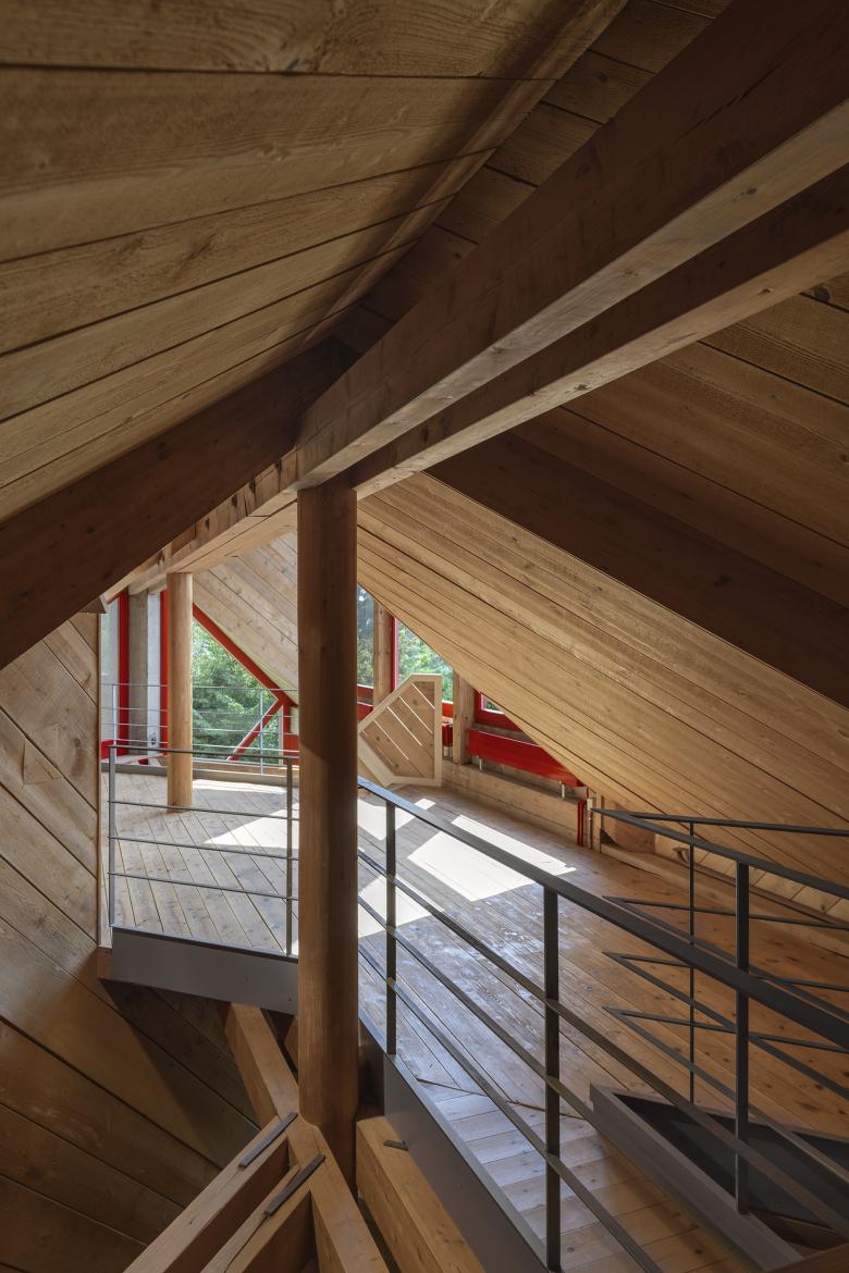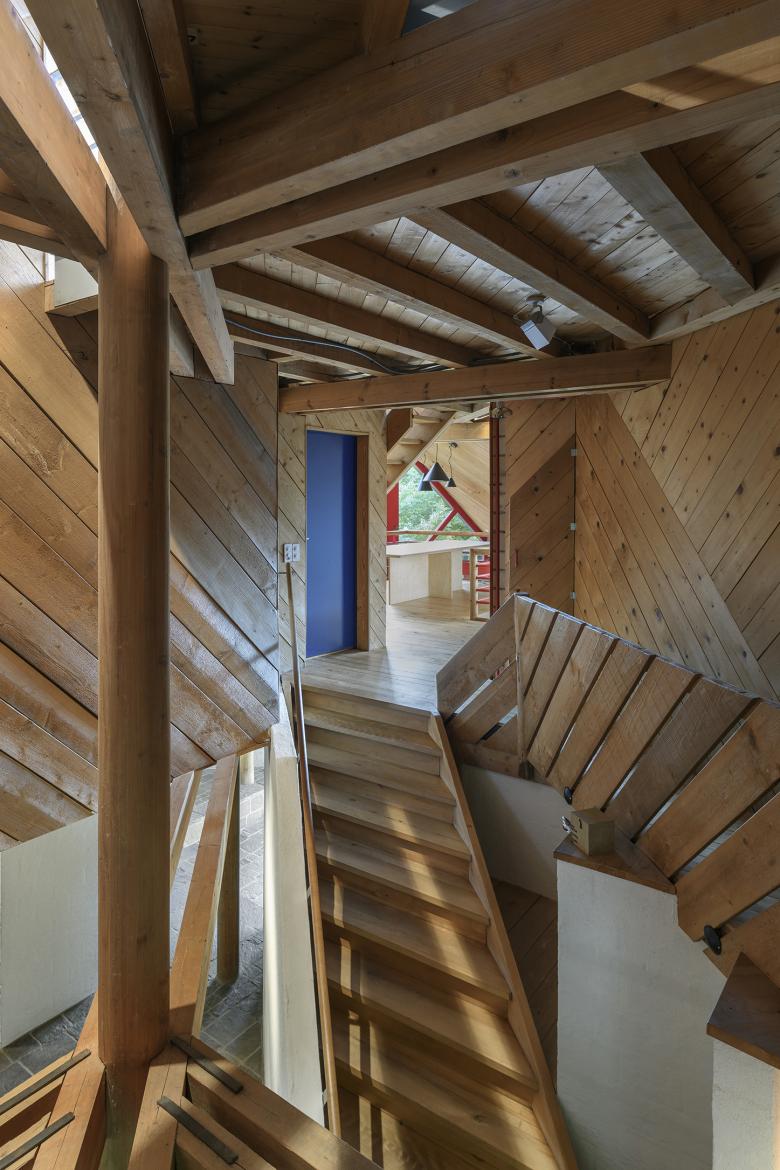 Im Inneren schafft der komplexe Grundriss überraschende Situationen in der Fläche, die Horizontalen spielen mit den Vertikalen und inszenieren spannende Lufträume, Gallerien, Ein- und Durchblicke. Darüberhinaus erzeugen gezielte Lichtführungen dunkle Tiefen und lichte Höhen die das eigenwillige Familienhaus endgültig zu einem begehbaren Gesamtkunstwerk machen.