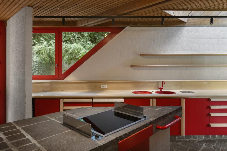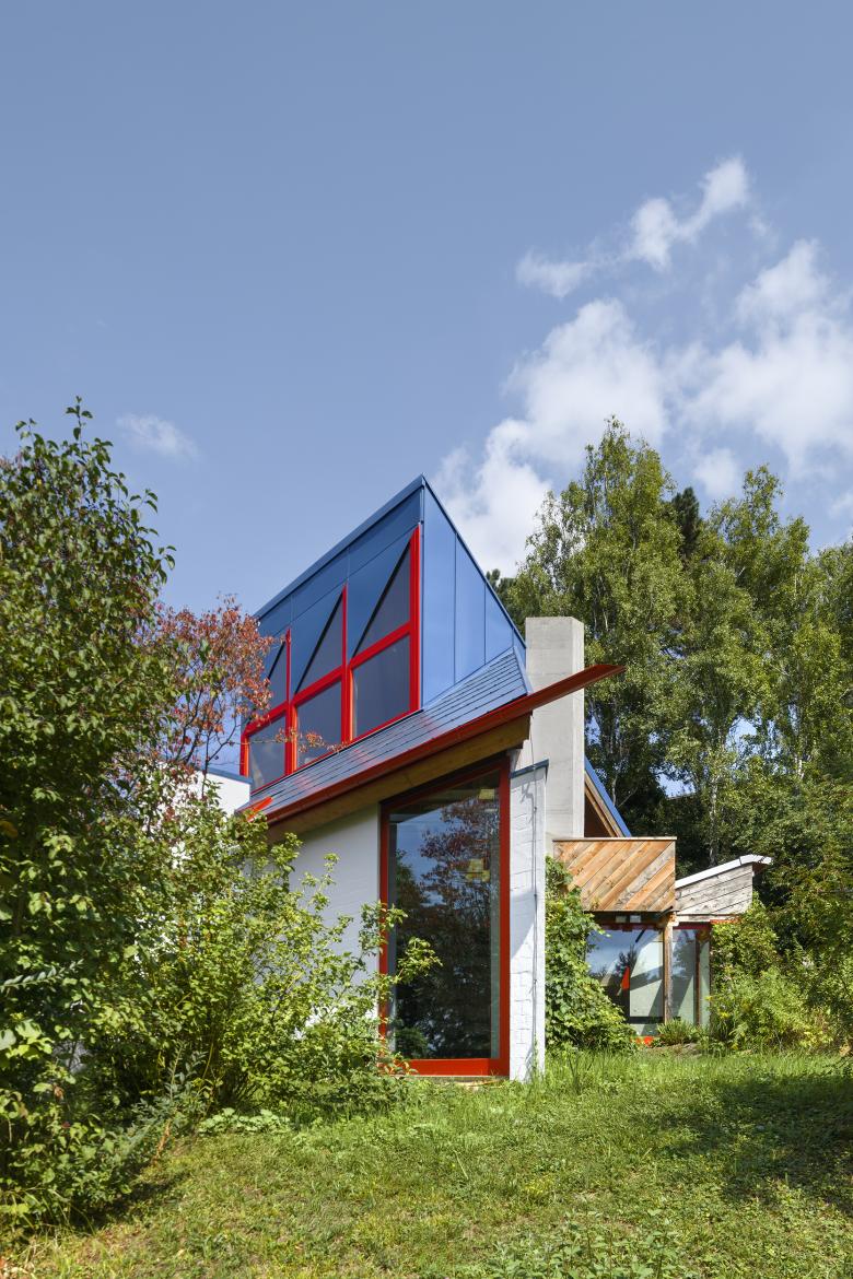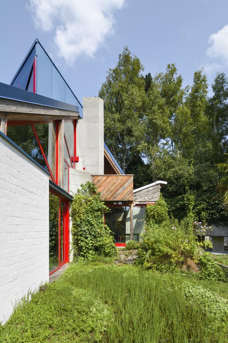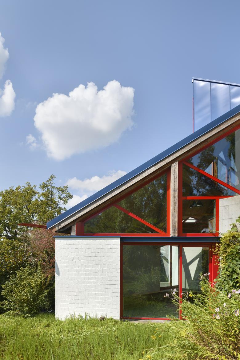 Der zackenförmige, durchkomponierte Baukörper aus Glas, Aluminium, Holz, Beton und Backstein folgt einem konsequent angewendeten System: über die hangparallel verlaufende Hauptachse des Baus wurde eine um 45 Grad abgedrehte Konstruktionsstruktur für den vertikalen und horizontalen Aufbau gelegt, das massive Untergeschoss trägt eine sichtbare Holzkonstruktion in Leichtbauweise. Der vordere Hausteil mit Wohn-, Essraum und Küche öffnet sich über grosszügige Fensteröffnungen und Oberlichter zum Garten. Der hintere Teil mit Schlafzimmern und Bädern dagegen verschliesst sich ganz privat.