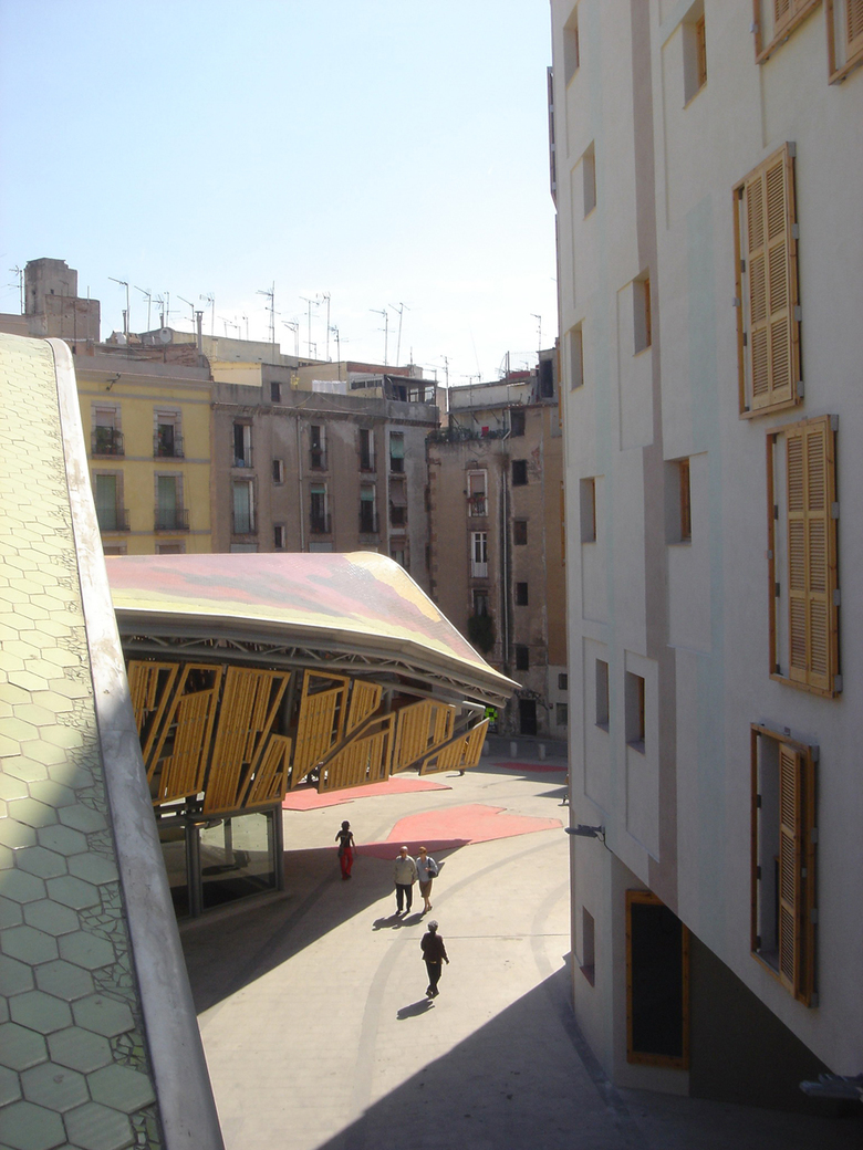 A competition was opened to restore the Santa Caterina city market located in the old quarter of Barcelona in 1997. EMBT won the bid with a proposal that aimed at incorporating the extreme complexity of the setting itself by creating a commercial market complemented by a residential zone and public spaces that integrated all the activities of the neighborhood. The project maintains parts of the existing structure and the architects proposed a new and creative render of the area which respected the history and context of the site. The proposal superimposes new architecture on old, mixes them, and comes up with a conglomerate, a hybrid that accentuates usefulness and is contemporary. The interior distribution of the market was reorganized; there are fewer stands but the access and service systems are rationalized; the surface area of public spaces gains ground and communicates with the Avinguda Francesc Cambó, an important transitional vein in the neighborhood also surrounded by a dense network of narrow streets