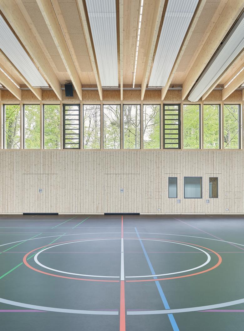 Für den Holzbau wurde ein wirtschaftlicher, ressourceneffizienter Ansatz gewählt: Filigrane Stützen und Träger aus Brettschichtholz bilden im Achsabstand von 1.25 Meter das Primärtragwerk der Spielhalle. Auf Nebenträger, bzw. eine Substruktur in der Fassade kann somit verzichtet werden. Das fein gegliederte Tragwerk bestimmt die Raumwirkung.