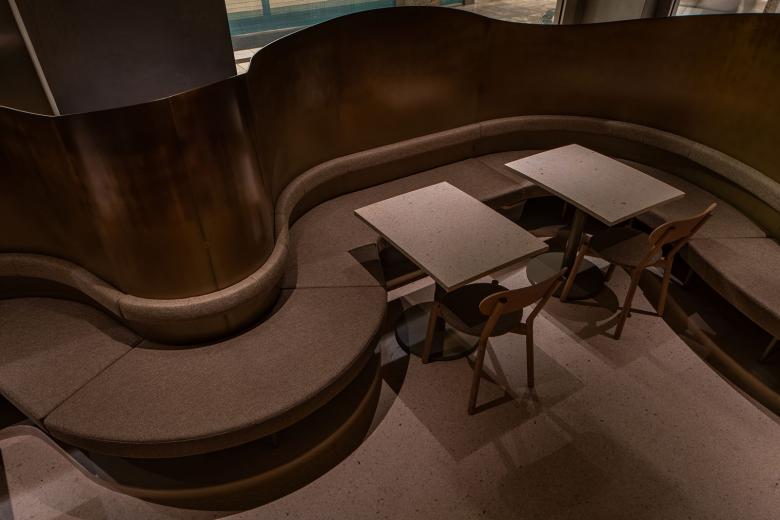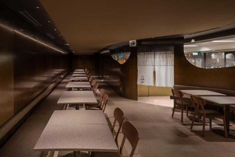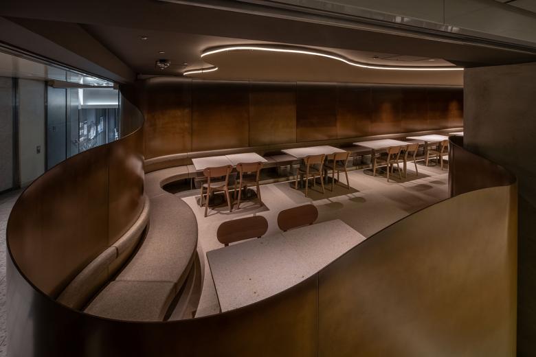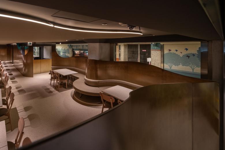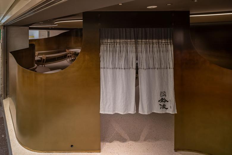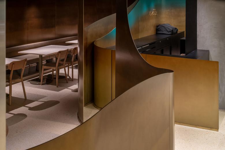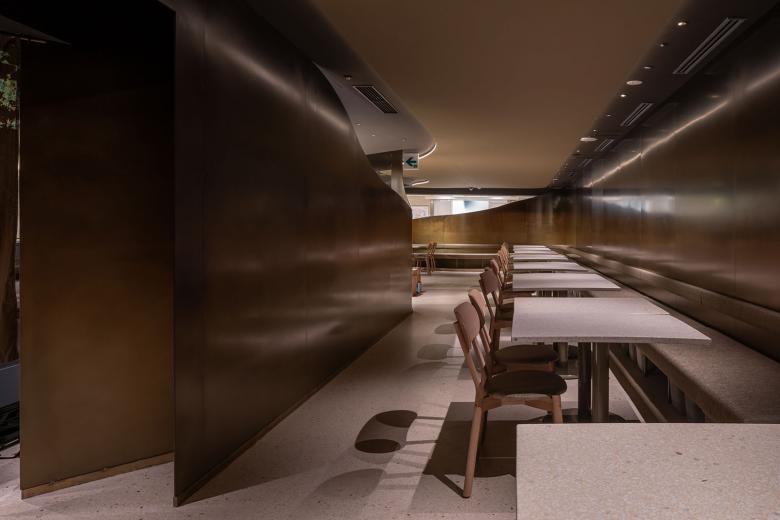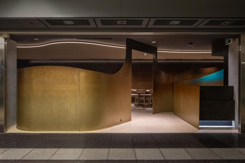店舗の壁は厚さわずか6mmの鉄板とし、高さを変えながら直線のリースラインに沿わず湾曲させることで、内外の距離感を揺らがす境界を生んだ。また、壁は既存躯体および照明との関係により奥行きと陰影が現れ、地下街において異質な存在感を放つ。この曲げ加工は制振性において極めて効果的な曲げ率としており、意匠・構造一体のデザインとなっている。