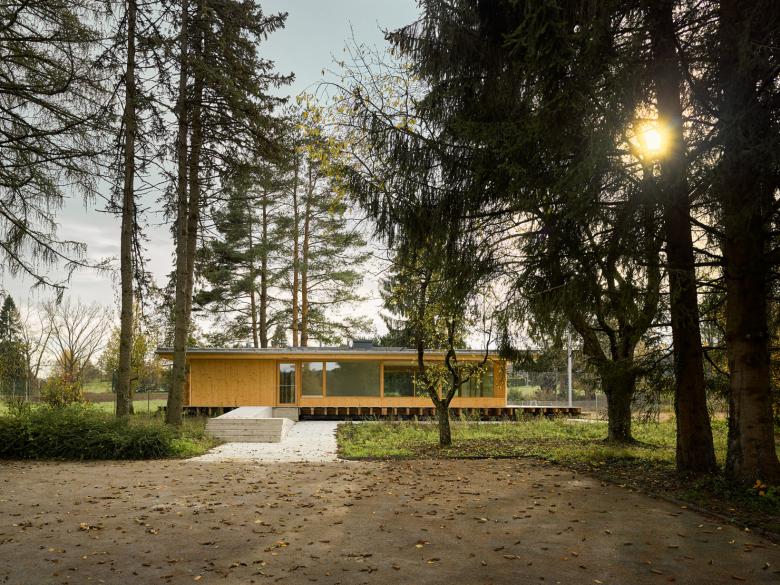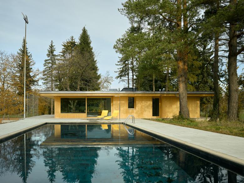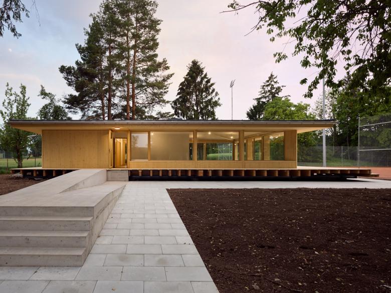 Am Waldrand von Zollikerberg gelegen, fügt sich das neue Tennisclub Haus still in seine natürliche Umgebung ein. Der flache, holzverkleidete Baukörper mit weit auskragendem Dach und umlaufender Terrasse wirkt wie eine Lichtung im Wald. Mit seiner langgestreckten Form und offenen Raumstruktur lädt das Clubhaus gleichermaßen zum Verweilen und zur Offenheit ein – stets im Dialog mit Bäumen, Himmel und Platz.
