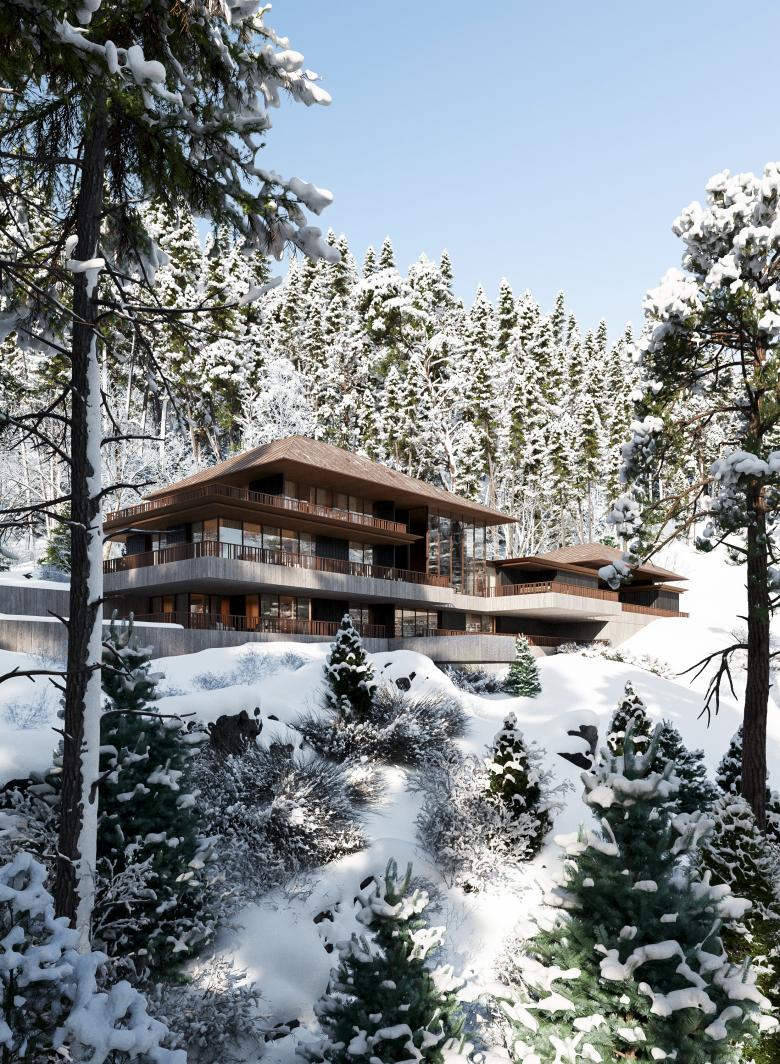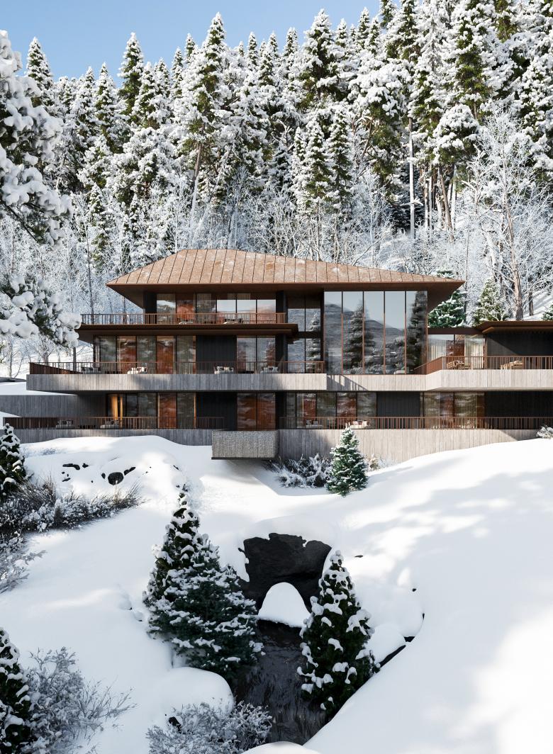 Material choices—corten steel, board-formed concrete, and charred wood—reflect the rugged local character and ensure long-term durability. A cantilevered pool and a ski-in/ski-out wing with automated slope access highlight the project's connection to outdoor living and sport.