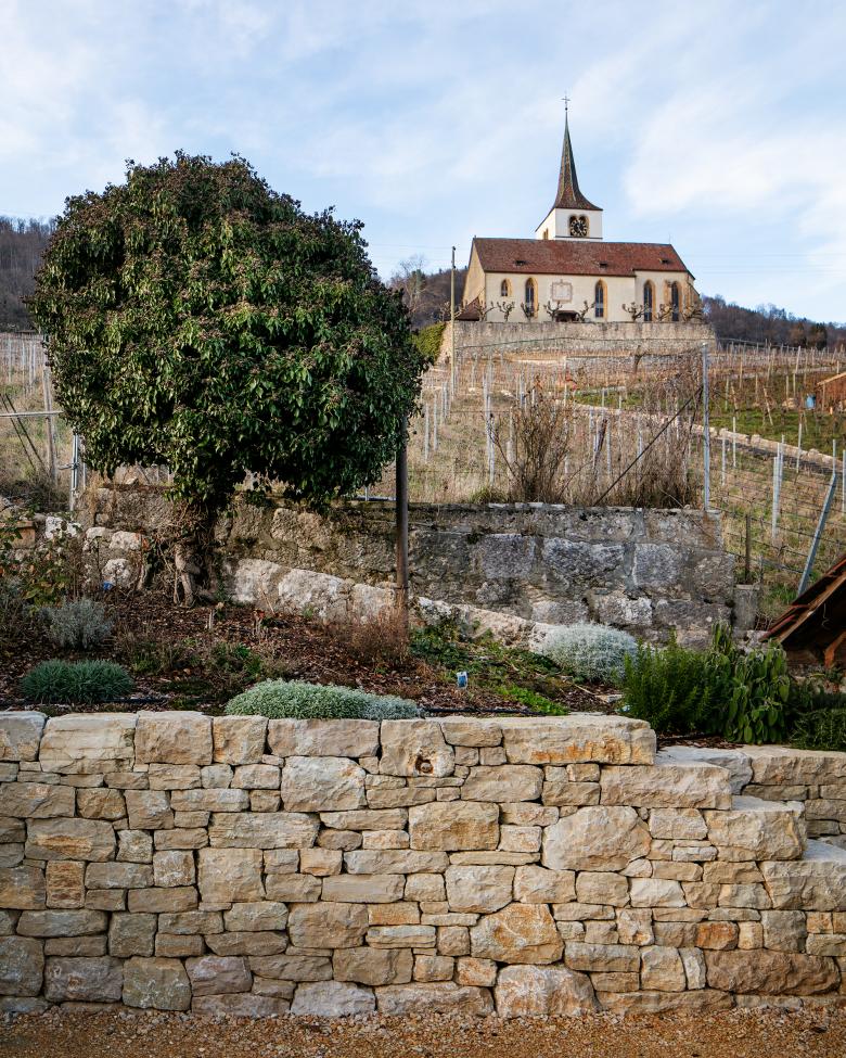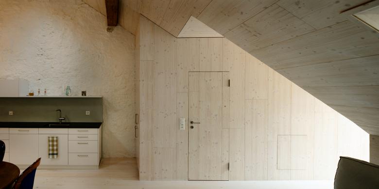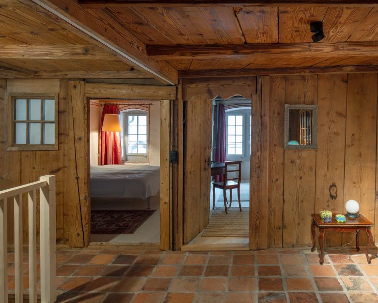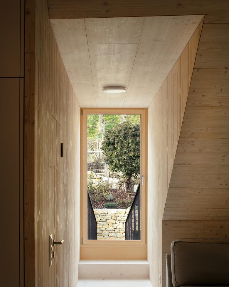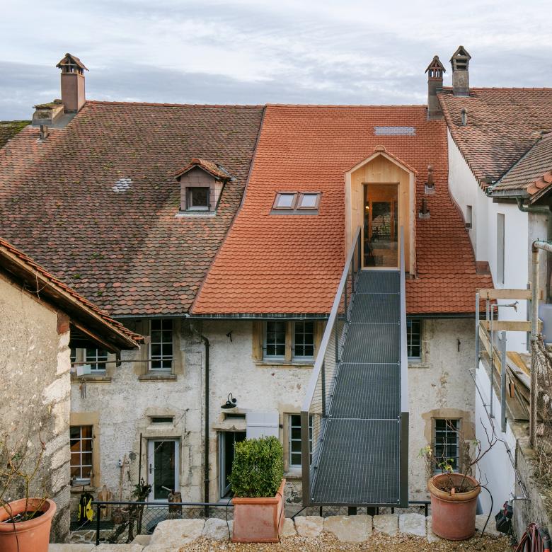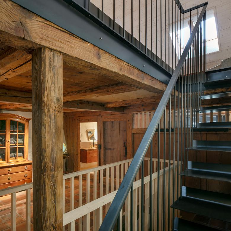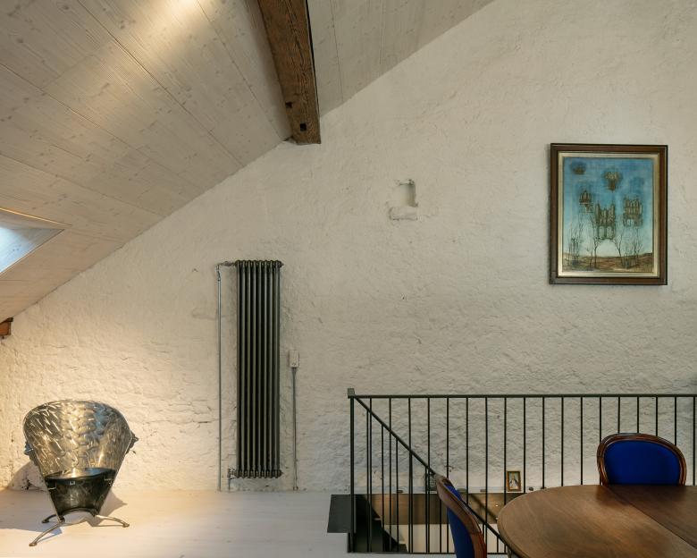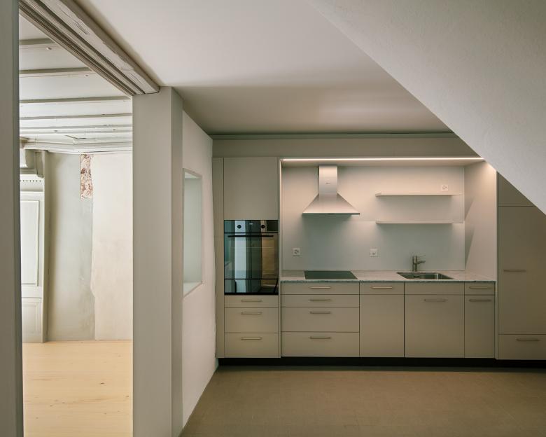 Vor Kurzem von neuen Eigentümern übernommen, die Wert auf den Erhalt der Bausubstanz legen und gleichzeitig zeitgemäße Wohnformen ermöglichen möchten, wurde das Haus in zwei Wohnungen umgestaltet. Das Hauptgeschoss wurde originalgetreu restauriert. Der ehemalige Dachboden dient heute als Wohnraum mit drei Schlafzimmern und einem Badezimmer – die historischen Raumproportionen und Materialien wurden dabei respektvoll beibehalten. Eine neue Gaube ermöglicht den Zugang zu einer rückseitigen Terrasse, die über eine filigrane Metallbrücke erschlossen ist. Die weiß gestrichenen Giebelwände, das helle Holz in Böden, Decken und Einbauten sowie die originalen Balken fügen sich harmonisch mit zeitgenössischen Elementen wie einer modernen Küche und grosszügigen Fensteröffnungen mit Blick auf den See und die Reben zusammen. Die sorgfältige Restaurierung der Fassaden sowie die neue Terrasse auf den gestuften Weinbergmauern setzen das bauliche Erbe fort und verbinden Vergangenheit und Gegenwart auf gelungene Weise.
