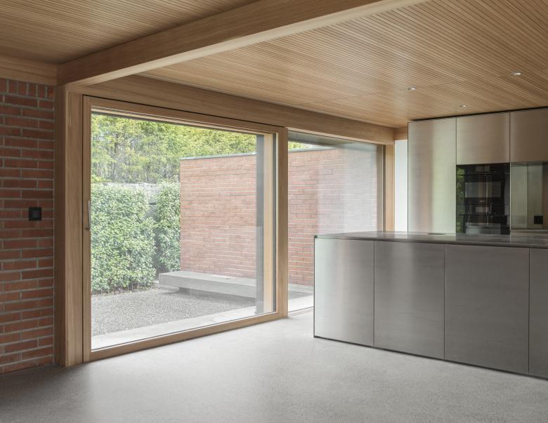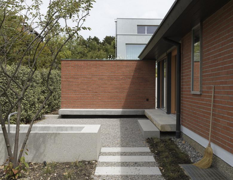 Die Erweiterung der Wohnfläche schliesst den ursprünglich U-förmigen Grundriss zu einer umlaufenden Wohnebene mit Innenhof, gestaltet als Kiesgarten mit Kiefer.
