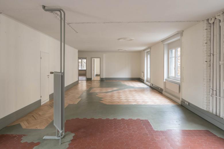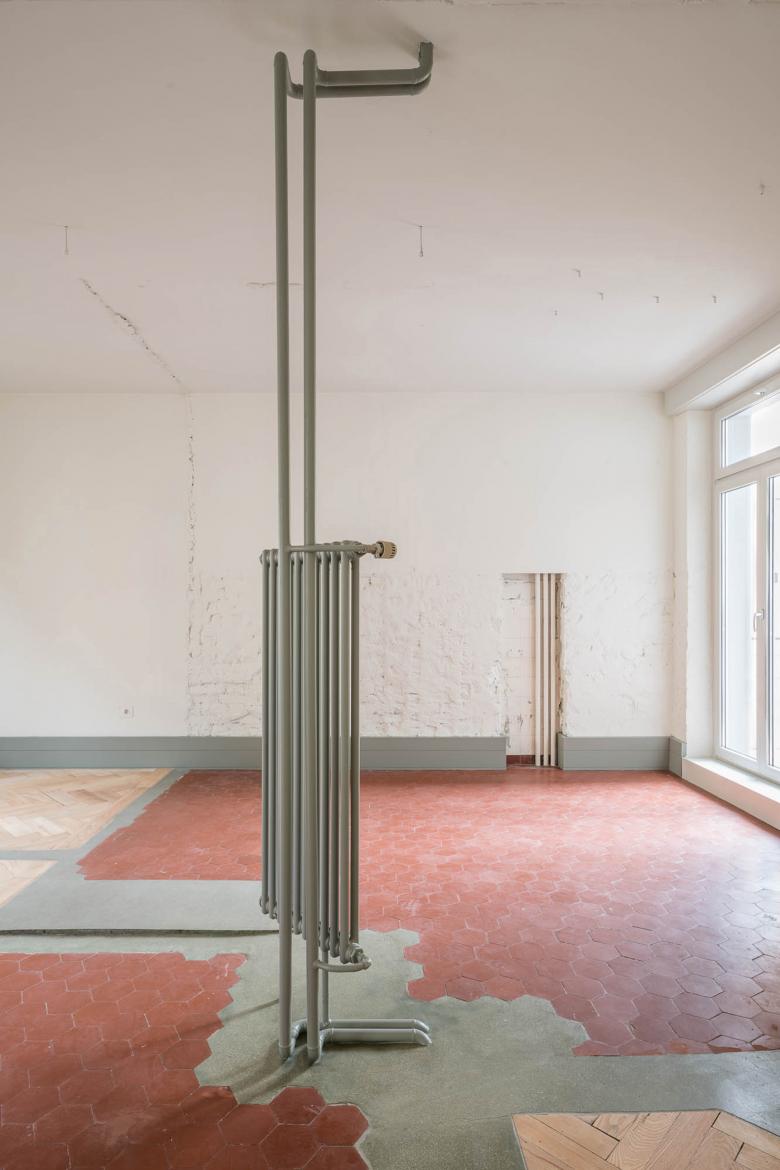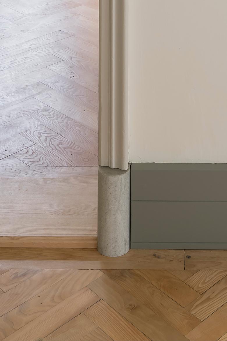Die Umbauspuren der vorherigen Zahnarztpraxis leben in den neuen Büroräumlichkeiten als Anhydrit-Flächen, überhohen Sockelleisten und Marmor-Ergänzungen der Türrahmen weiter - der graugrüne Farbton wiederholt sich überall "as found" im originalen Heizkörper.