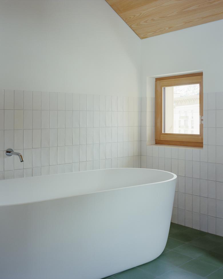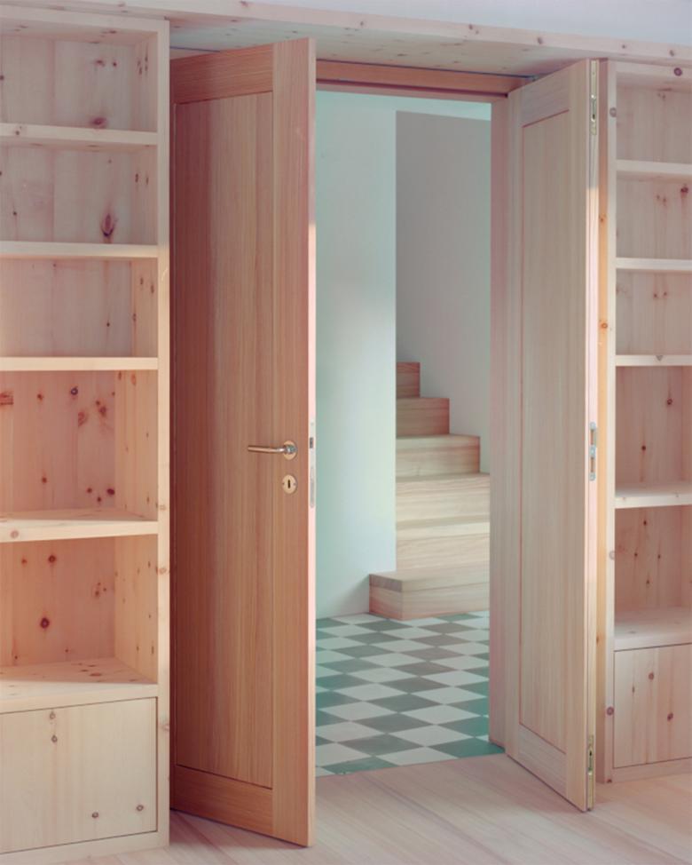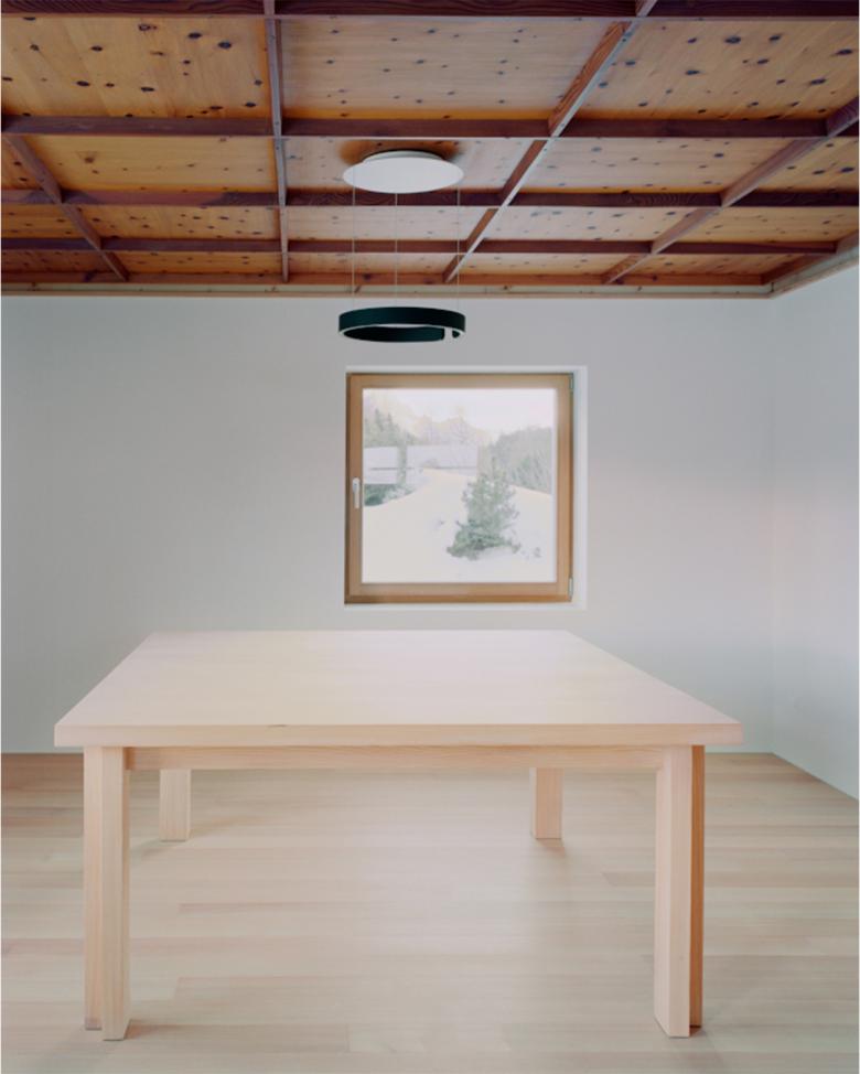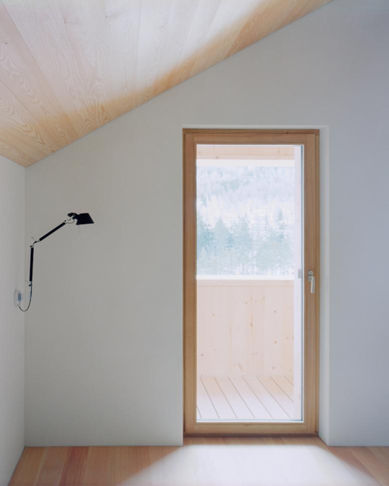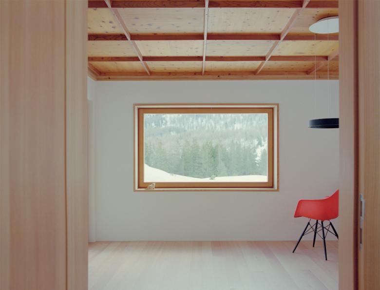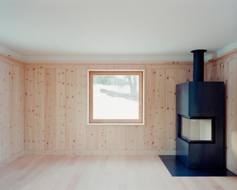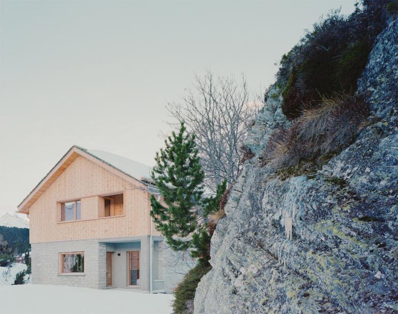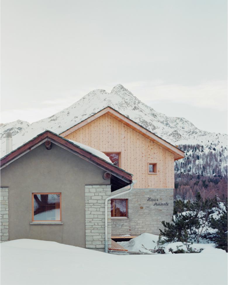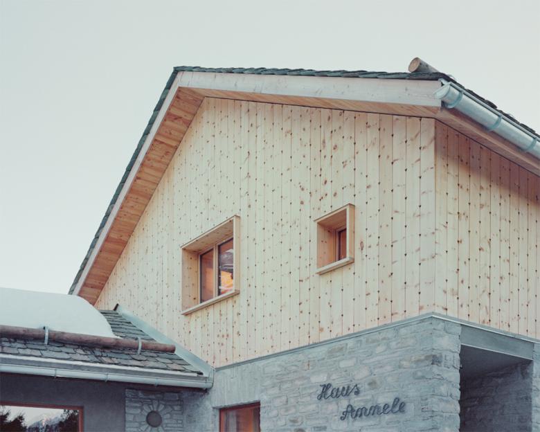 Das Dachgeschoss wurde entfernt und 1 Meter höher wieder aufgebaut, wobei eine Ganzholzlösung gewählt wurde. Außen besteht die Verkleidung des ersten Stocks aus vertikalen Zirbenholzbrettern mit Schnitzereien, die die Engadiner Stube paraphrasieren.