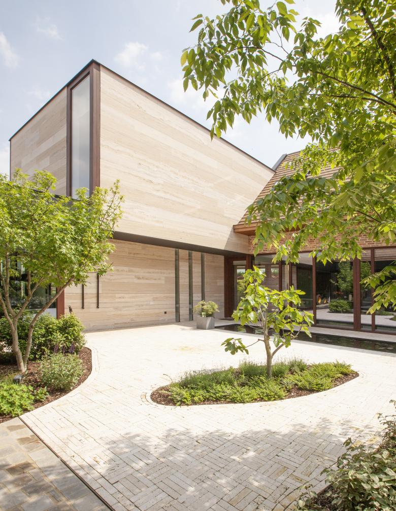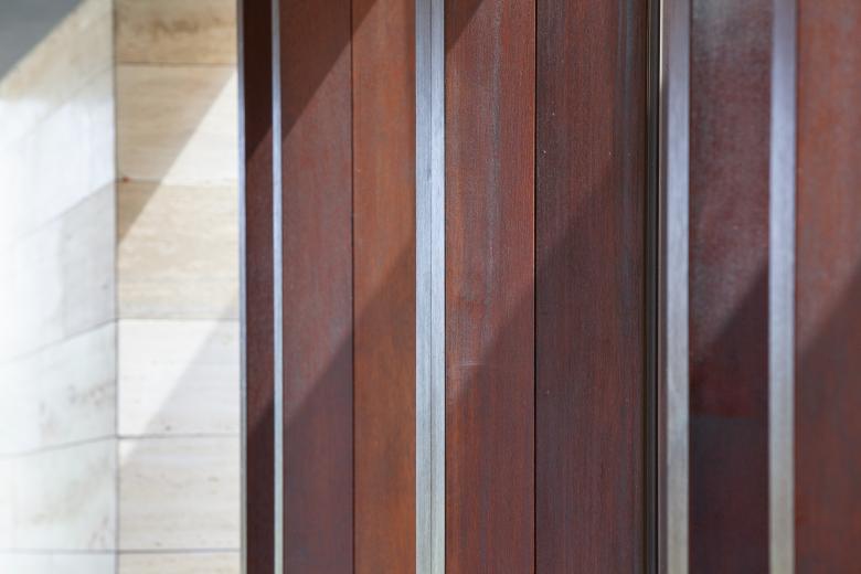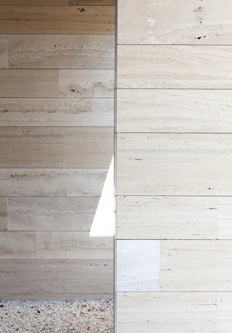 De natuursteen geeft ook het terras vorm. De hoeken zijn daarbij niet afgesneden, wat de openheid naar het landschap versterkt. Het terras definieert het grondplan van de nieuwbouw ook in de buitenomgeving. De bureauruimte krijgt een eigen gekadreerd terras waarvan het dak deels is geperforeerd. Het terras krijgt zo twee volledig verschillende belevingen.
