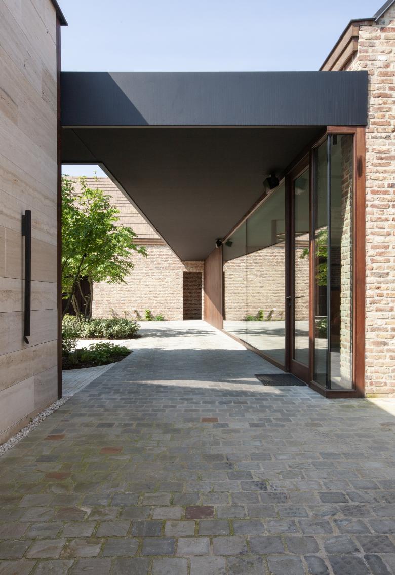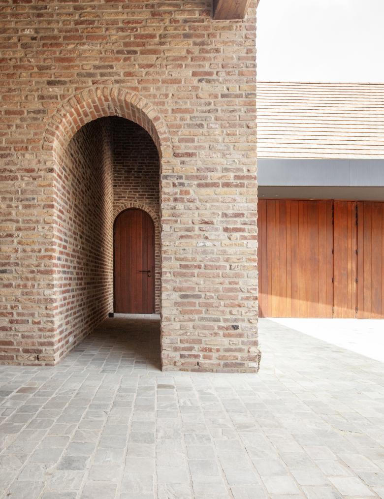 Een nieuwe deur naast de grote poort biedt bezoekers een gemakkelijke toegang tot de binnenkoer en de voordeur. Dat pad zorgt voor een zachte, geleidelijke overgang van de publieke naar de private sfeer. De uitwerking van deze secundaire toegang is verfijnd: daglicht accentueert de bakstenen wand onder de overdekte doorgang, de houten deur en poort verwijzen naar de houten spanten in de hoeve. Die bleven maximaal bewaard om de robuuste uitstraling intact te houden.