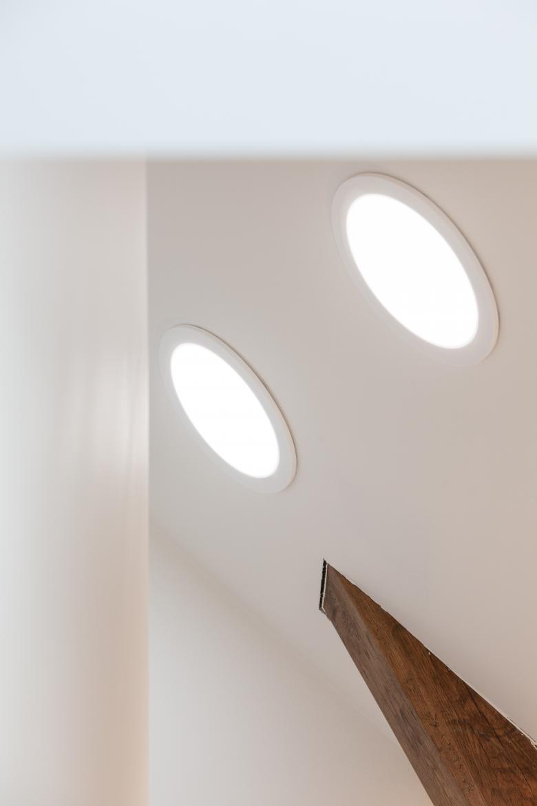 Occasionally placed circular roof openings channel daylight down to the night landing, emphasizing the height of the farmhouse and creating natural spotlights on the timber beams.