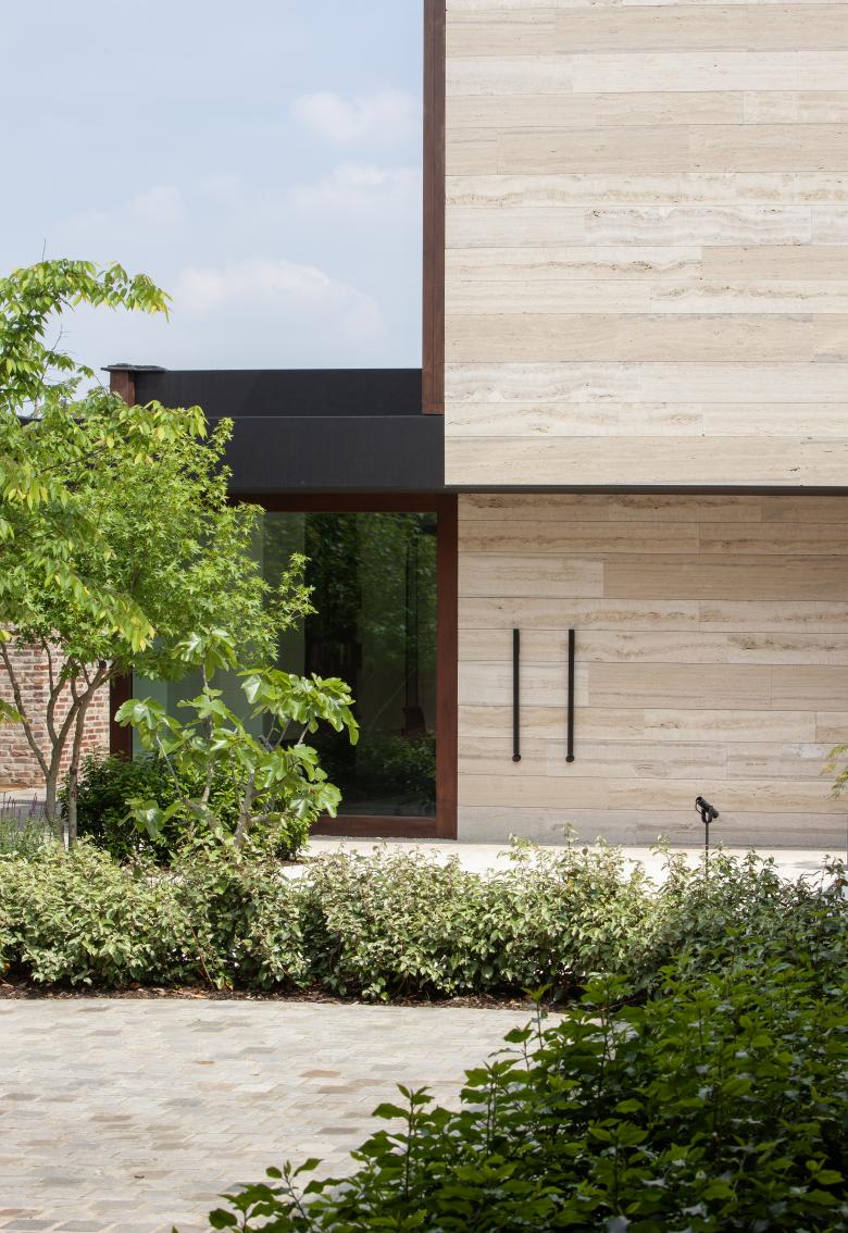De uitbreiding aan de achterzijde van de hoeve met daarin de zitruimte en het thuiskantoor zijn in natuursteen uitgewerkt. Het gestyleerde volume verstopt zo niet dat het om een nieuwe toevoeging gaat. Tegelijkertijd is de materiaalkeuze respectvol voor de bestaande baksteenarchitectuur. Het houten schrijnwerk is een consequente rode draad tussen oud en nieuw. Het schrijnwerk is hier wel anders vorm gegeven dan in de glaswand aan de binnenkoer. Ze reiken tot op de hoeken van de gevels.