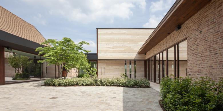 The barn on the left side of the farmhouse has been opened with a glass wall, serving as storage for the client’s car collection. From the kitchen, one can view the collection across the courtyard, and the fitness area in the extension also provides clear sightlines to the vehicles.