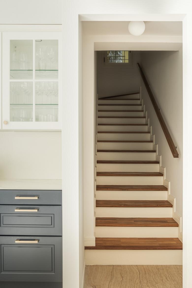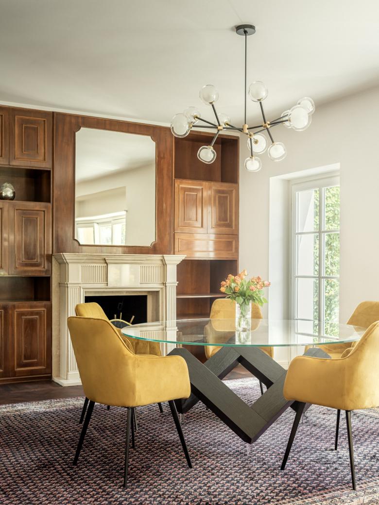 The kitchen is located on the mezzanine floor, in a space annexed to the volume in the 20th century. The irregular shape of the space required careful planning in close collaboration with experienced craftsmen who made all the custom-made moulded furniture. The sapphire and ivory tones give it a classic look, in respect with the architecture of the villa.