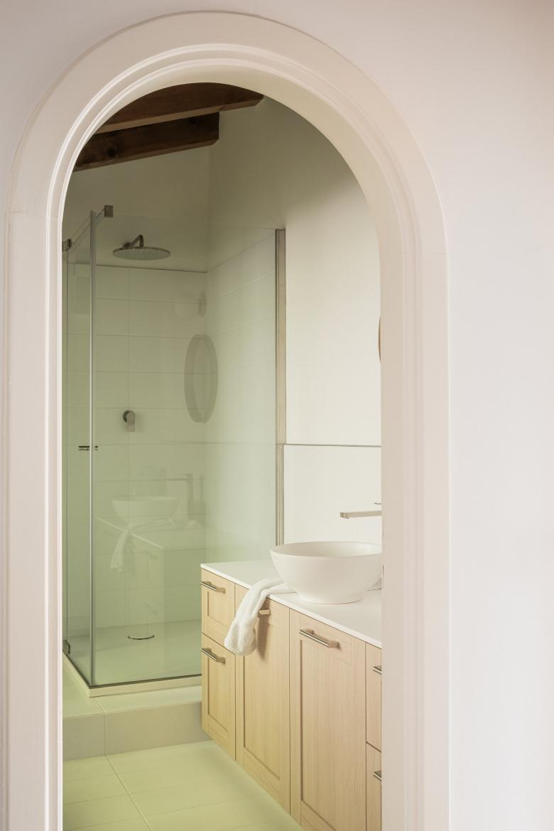 The en-suite master bathroom is clad in white travertine slabs with slight sea-green veins that enrich the hues of this natural stone, providing ever-changing colour nuances depending on the external light. The other two bathrooms are clad with Sirone ceramics with brushed stainless steel faucets made in Vicenza, which makes the design more contemporary than the other rooms.