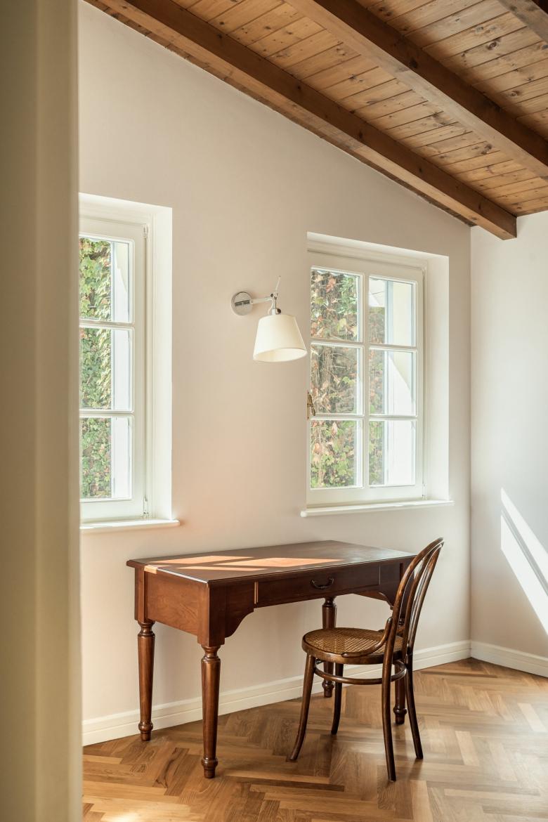 The architectural intervention involved the complete renovation of the building, in particular of the entire plant engineering, kitchen, bathrooms and surfaces. The roof was also reclaimed, replacing the old roof tiles. The original pantographed wooden frames, doors and skirting boards, were moderately recovered thanks to the professionalism and specific know-how of local Como craftsmen. All the original teak and panga-panga floors, laid in the Italian herringbone pattern, are also part of the recovery of materials that are now almost off the market.