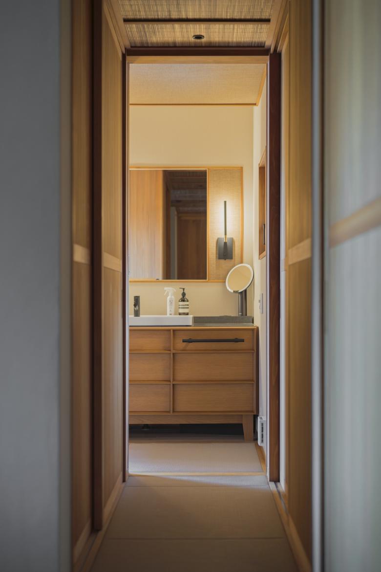 メイン棟は温泉旅館のような空間で、既存の木造の骨組みを活かし、木や葦簀、珪藻土などの自然素材を用い、床暖房の効いた柔らかな畳が敷かれている。