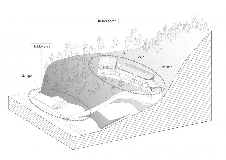 ヴィラは、敷地の丘の上にある3棟の建物からなるリトリートエリアと、丘のふもとのホビーエリアの大きく2つのエリアで構成されている。